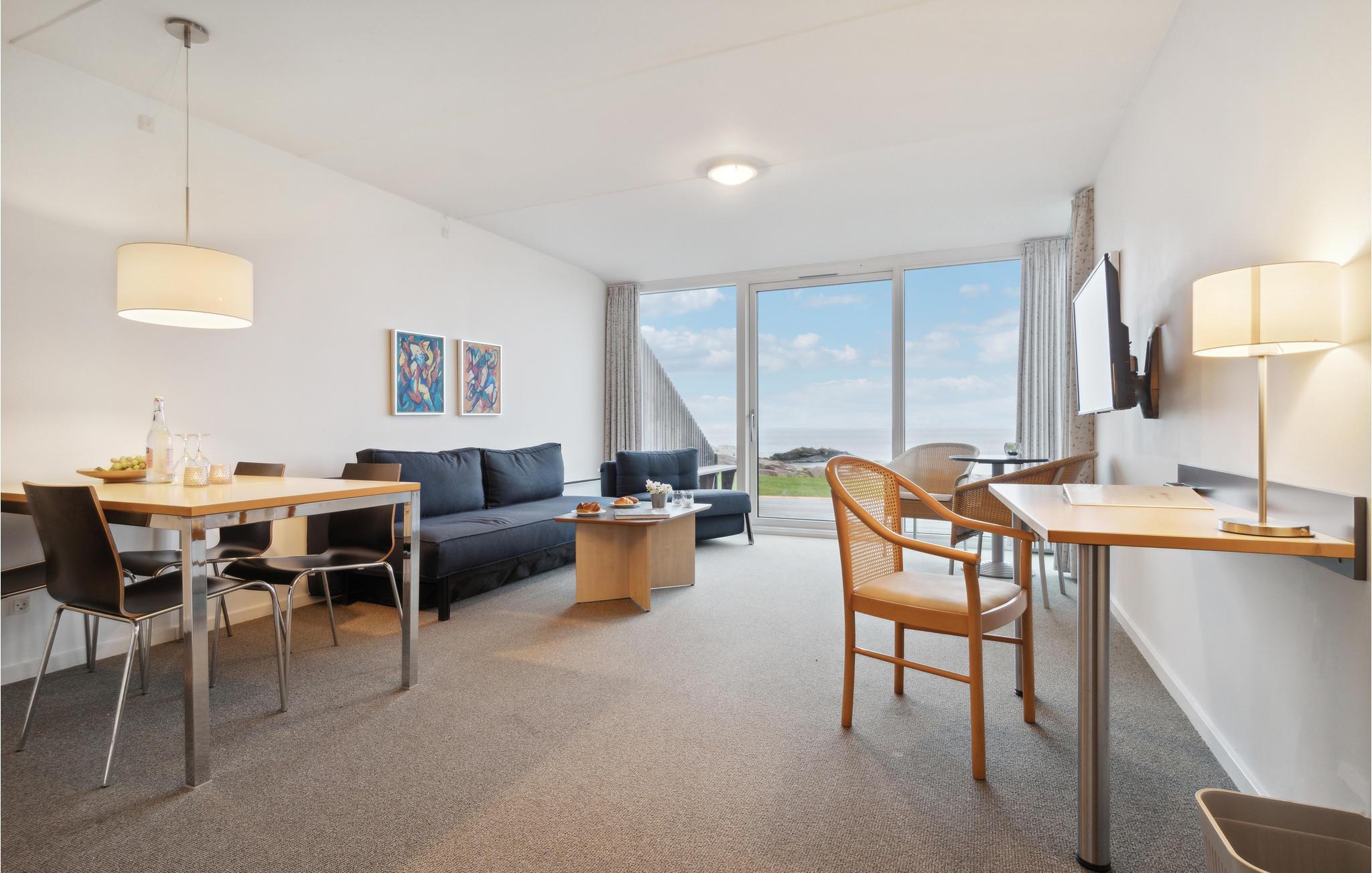 Lejlighedens hjerte er den attraktivt indrettede opholdsstue med både dobbelt og enkelt sovesofa samt TV, hvor I kommer til at tilbringe mange hyggelige stunder. I det åbne køkken kan I tilberede lækre feriemåltider. Det gode soveværelse er også udstyret med et TV, så I kan se film fra under dynen. Det lækre badeværelse har behagelig gulvvarme og et spabad, som indbyder til rendyrket afslapning efter en aktiv feriedag. Til lejligheden hører en terrasse med havemøbler og storslået panoramaudsigt over havet - det perfekte sted at nyde morgenkaffen og et godt glas vin om aftenen. Rejser I med flere par eller vennefamilier, kan I booke ekstra ferielejligheder i det smukke feriekompleks, afhængig af tilgængelighed.