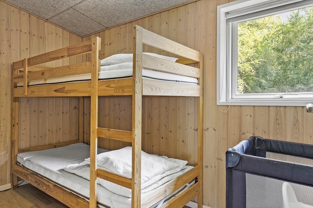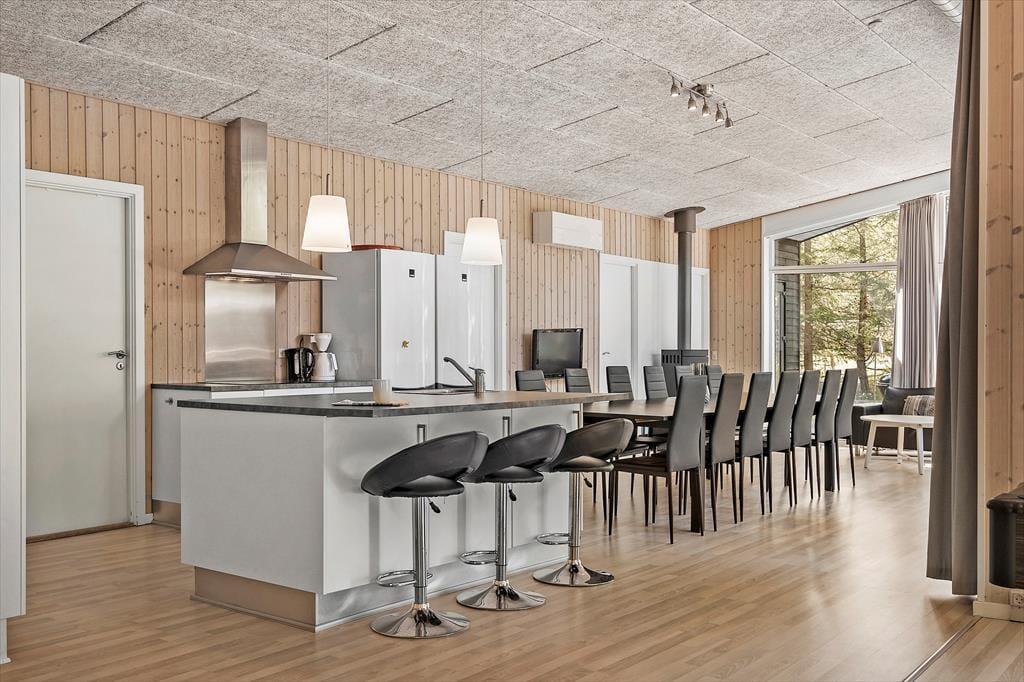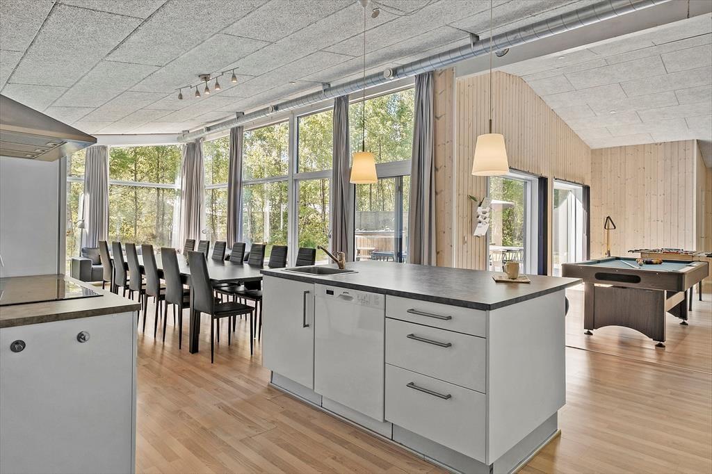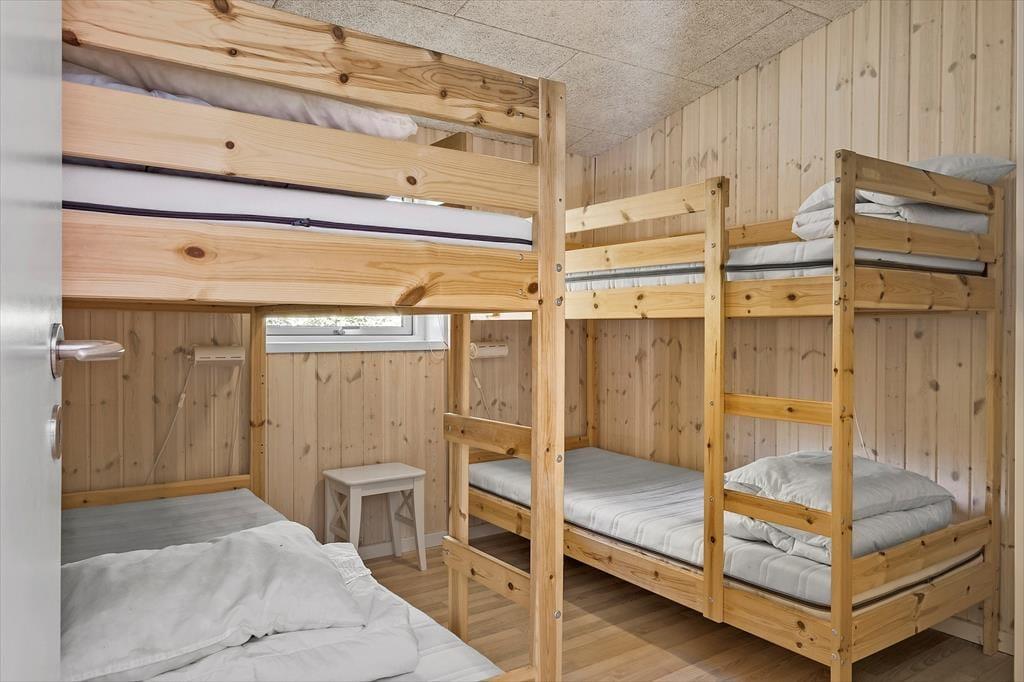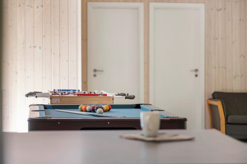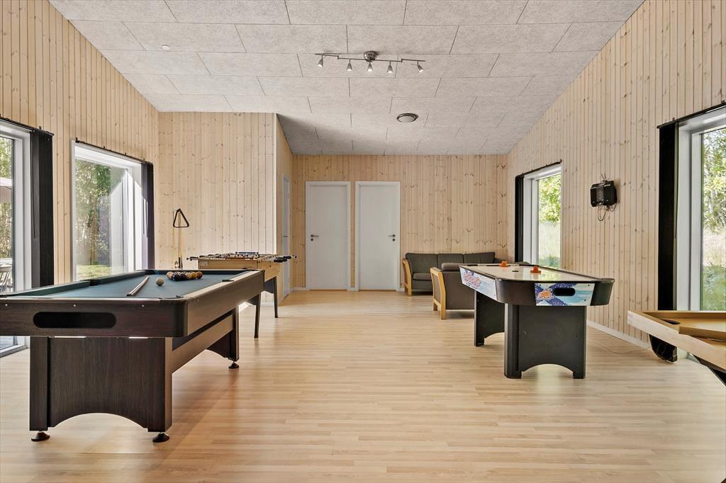 Der hviler en dejlig atmosfære over rummene i sommerhuset, der har store vinduer, lyse trævægge og akustiklofter, der går helt til kip. Husets seks soveværelser er fornuftigt fordelt i flere ender af huset, og de er udstyret med en blanding af dobbeltsenge, enkeltsenge og køjesenge, så der er noget for ethvert behov. Når I er mange samlet, er det smart, at der er to badeværelser i huset – og så har det ene endda wellness-faktor i form af et spabad. Opholdsafdelingen består af stue, aktivitetsrum og køkken i åben forbindelse, så her kan I lave mad, samles omkring langbordet eller slappe af i sofaerne nær brændeovnen. En del af selskabet kan også spille pool, bordfodbold og airhockey, og hvis alle vil være med, kan I lave turneringer for at finde feriens absolutte stormestre.