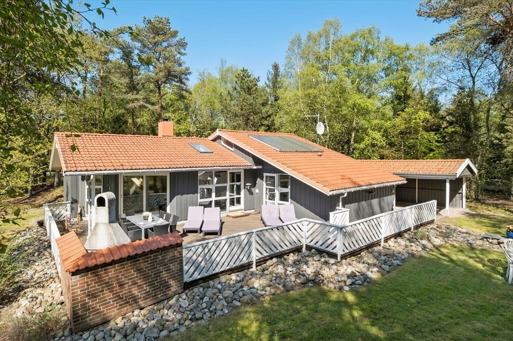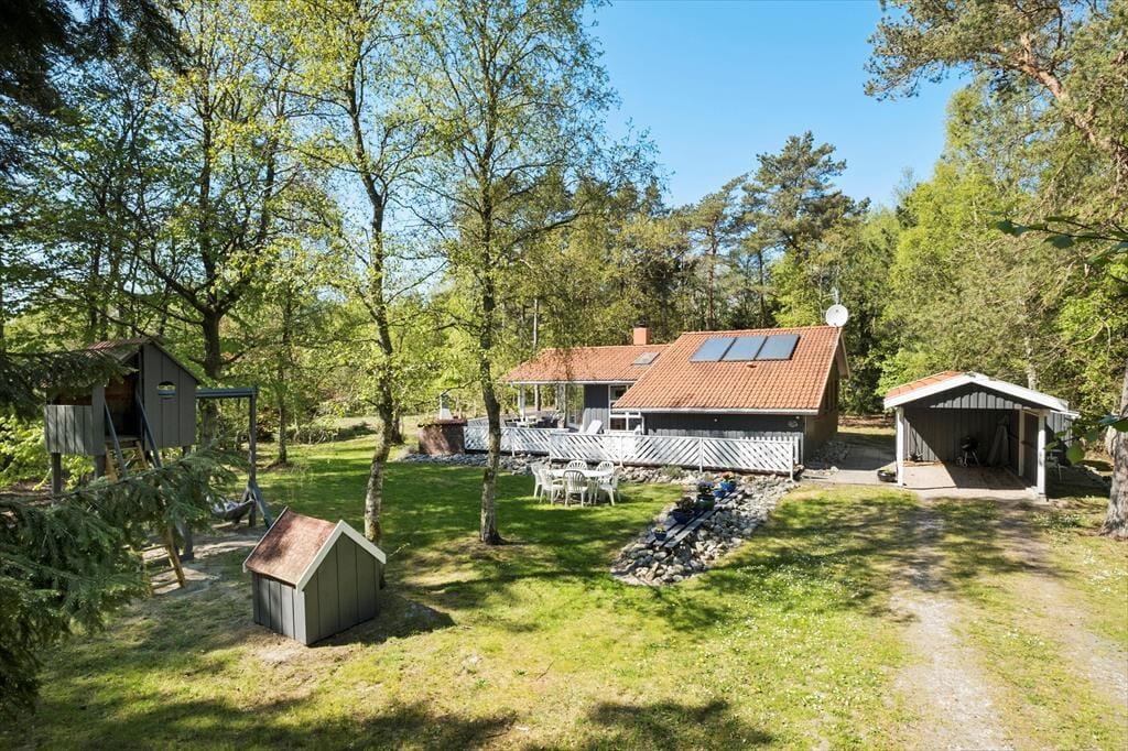 Den store naturgrund er en fredfyldt oase for både store og små feriegæster. Løv- og nåletræer rammer græsplænen ind på smukkeste vis, og hjørnet med legefaciliteter vil sikkert blive et hit for børnene, mens bilejere vil værdsætte carporten. Elsker I at slikke sol, er det herligt at kunne slå sig ned på den sydvendte terrasse – og hvis I bliver hængende helt indtil aftentid, kan I tænde op i stenovnen og nyde synet af flammerne, mens mørket falder på.