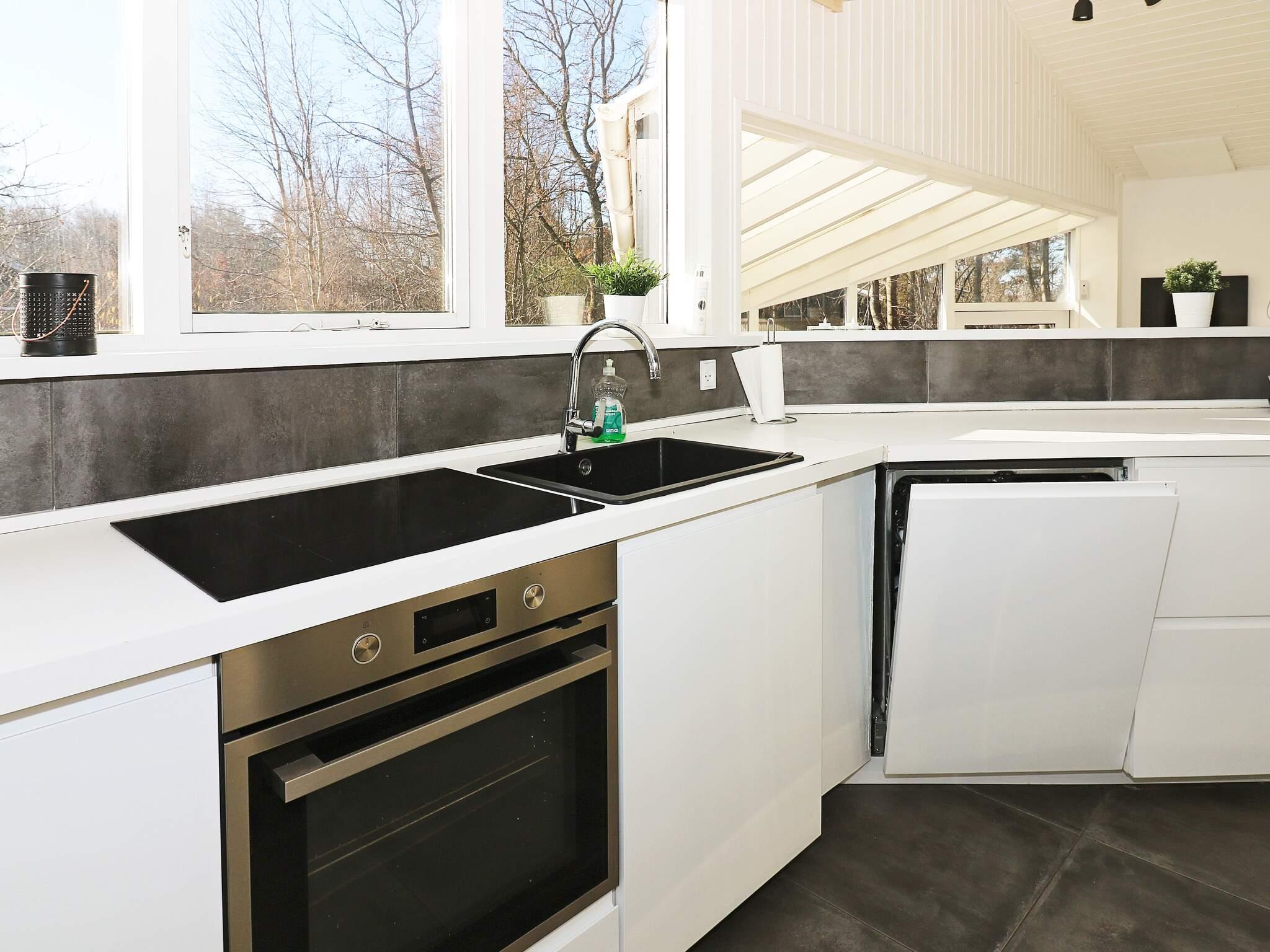 Sommerhuset er opført i 2 niveauer, der er forbundet med ganske få trapper. Stort og lyst køkken/alrum med god spiseafdeling og sofahjørne med TV uden kanaler men med Chromecast til streaming af egne tjenester. I forbindelse men køkken/alrum er der et par trin ned til stuen, og udgang til terrassen.
