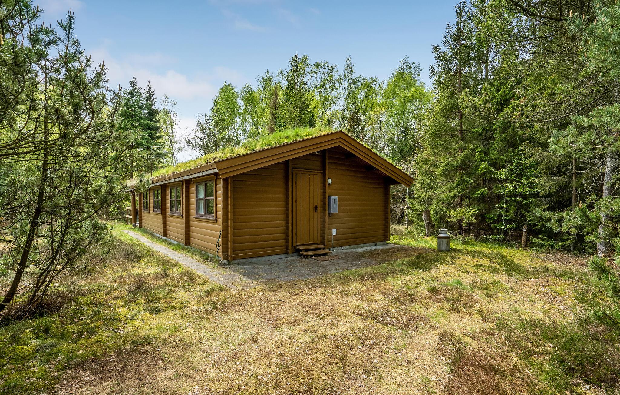 Hyggelig svensk bjælkehytte med græstag.
