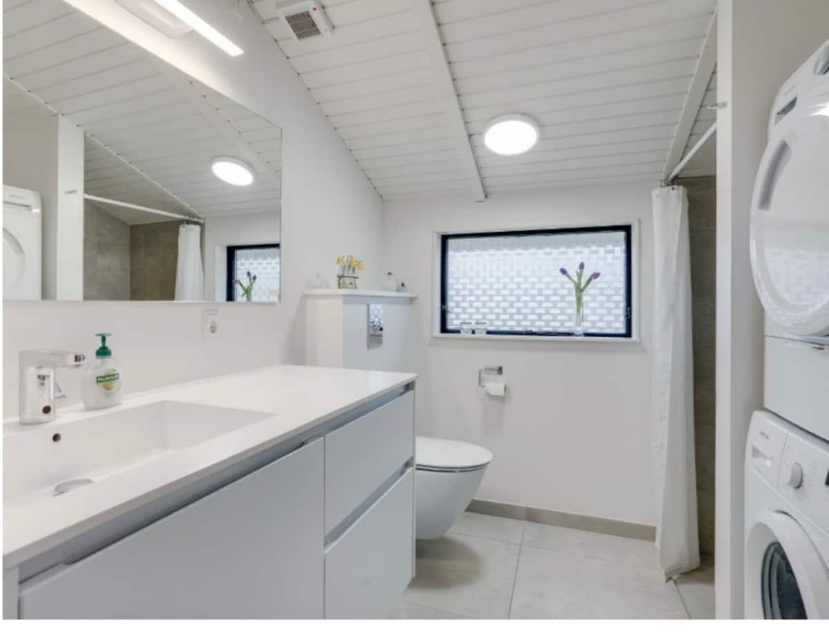 Her er 3 soveværelser. To af soveværelserne har dobbeltsenge og det tredje soveværelse er indrettet med to enkeltsenge. Her er et dejligt badeværelse med brusebad og gulvvarme og også vaskemaskine og tørretumbler.