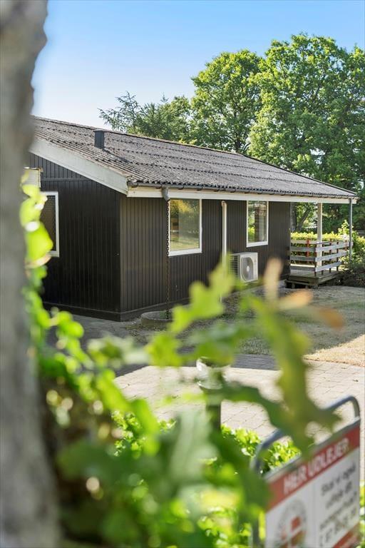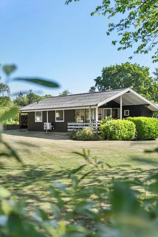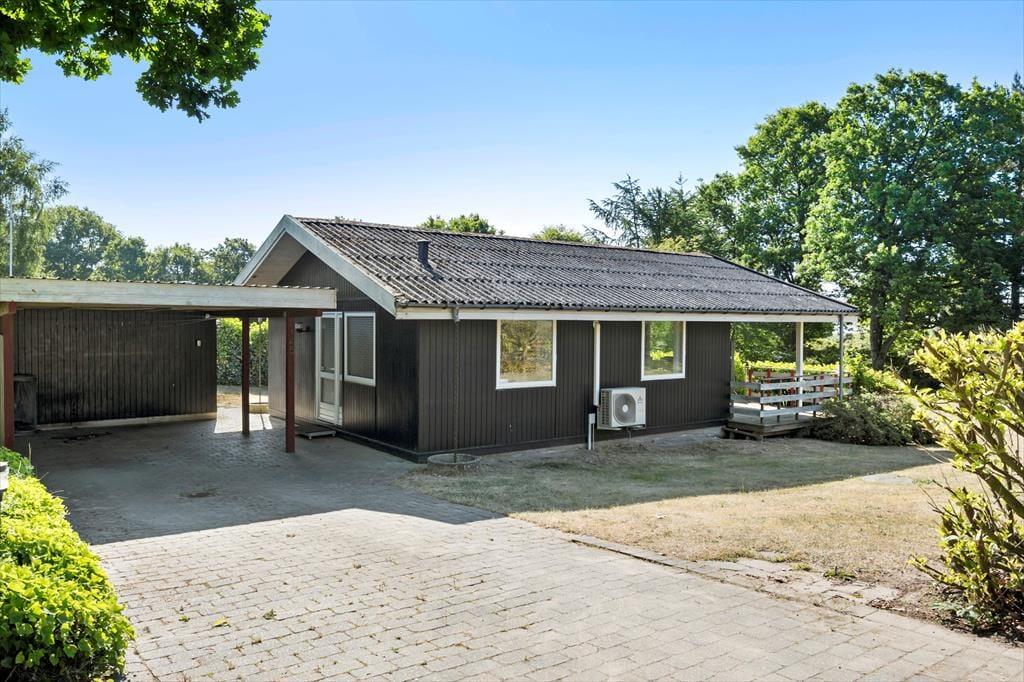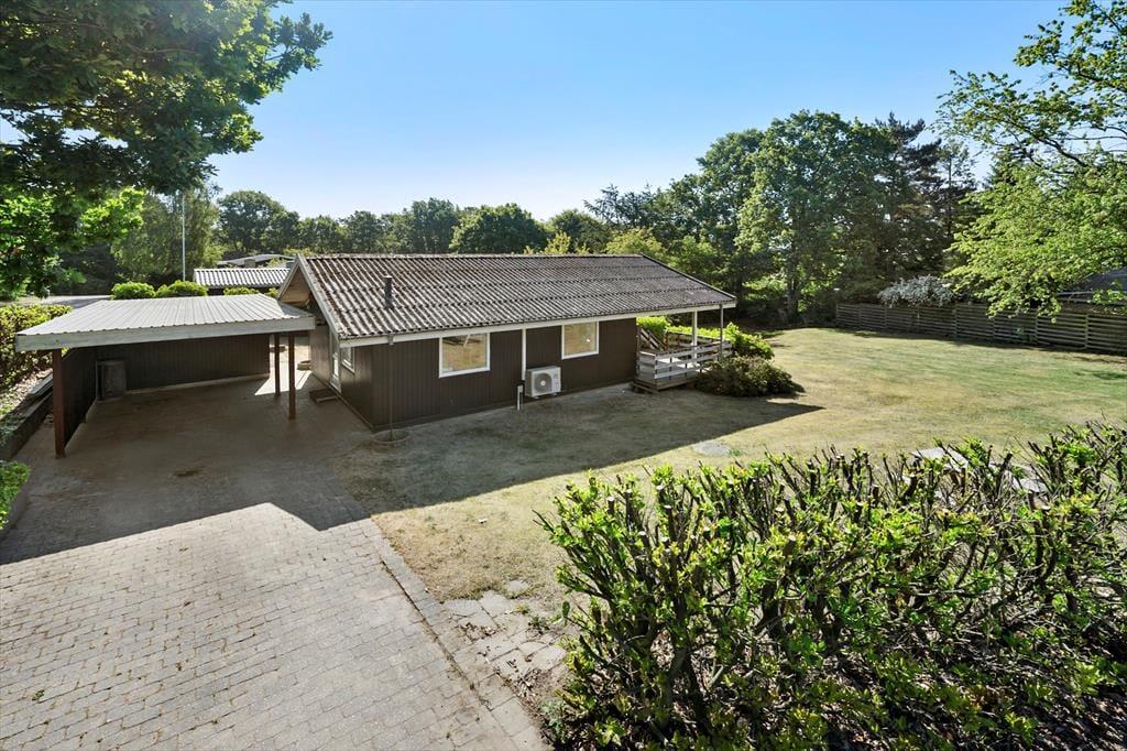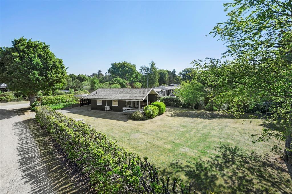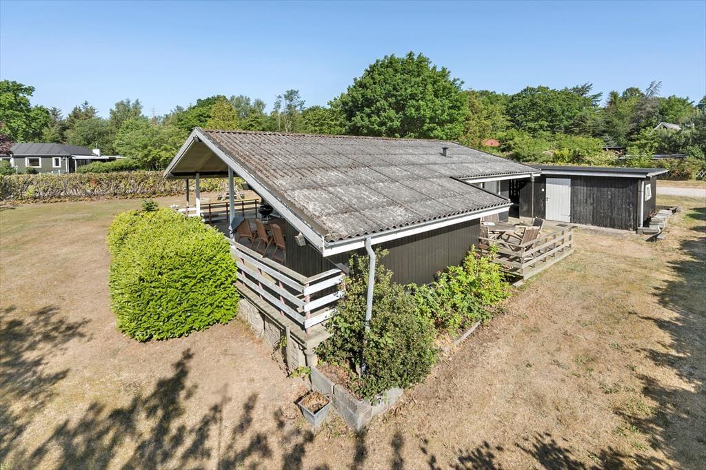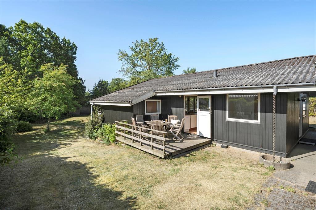 Fra den dejlige overdækkede terrasse er der udsigt til haven. Her er havemøbler og en stor let skrånende græsplæne med mulighed for leg. Sommerhuset er beliggende på naturgrund med opvoksede træer og buske. I haven kan man finde mange hyggelige kroge, hvor der er helt vindstille og hvor solen kan nydes i fulde drag.