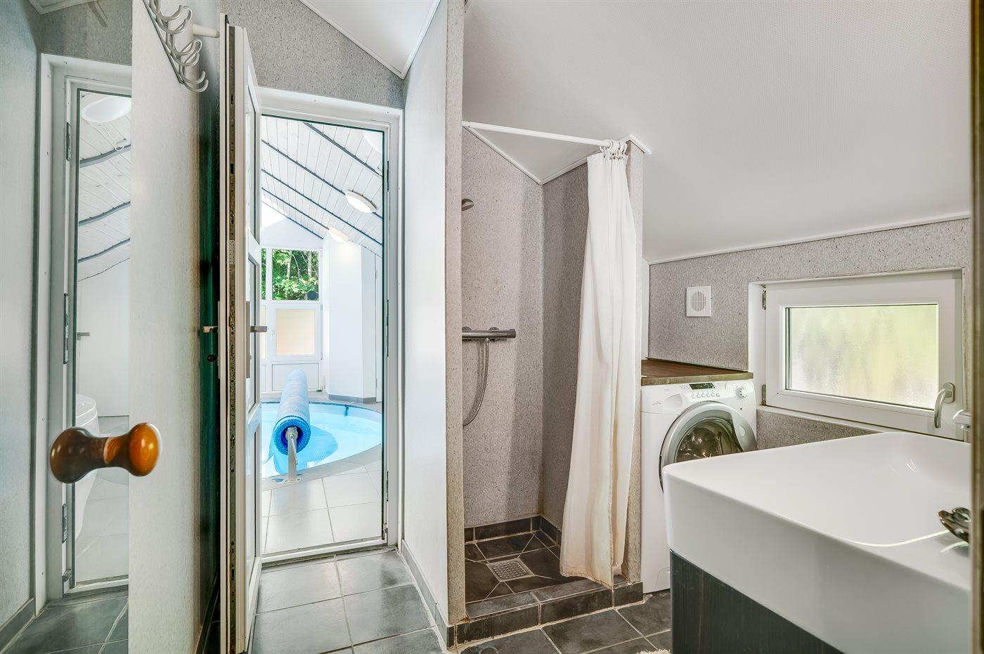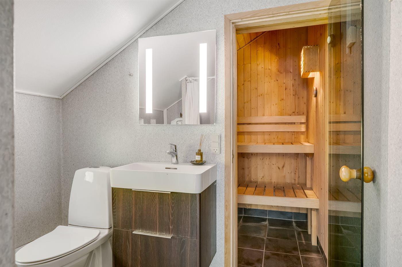 Der er 2 badeværelser med bruseniche og 2 toiletter I saunaen er der mulighed for afslapning.