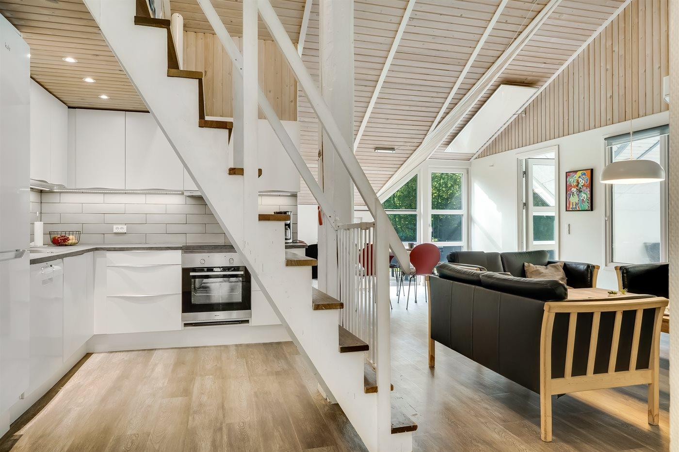Der findes et helt nyt køkken med induktionskogeplade, varmluftovn, opvaskemaskine og køle-/fryseskab samt mikrobølgeovn.