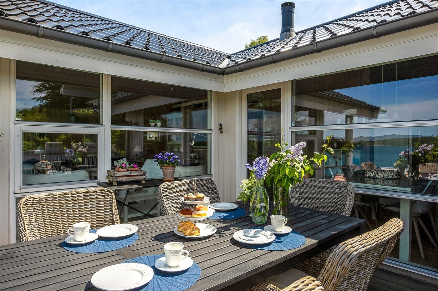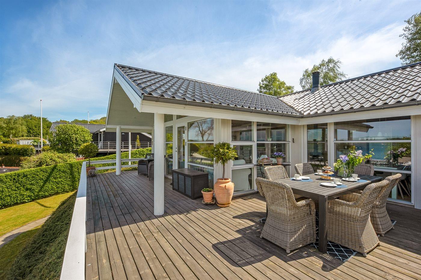 Hyggeligt sommerhus ved Vejle Fjord med panoramaudsigt og store terrassearealer, perfekt til en afslappende ferie.
