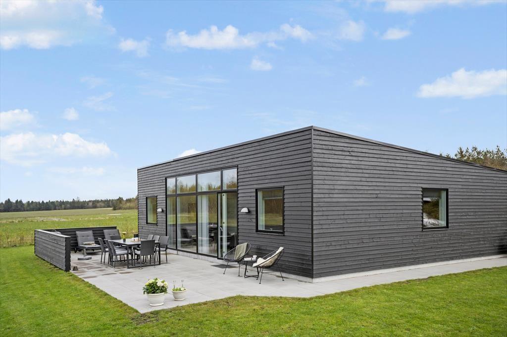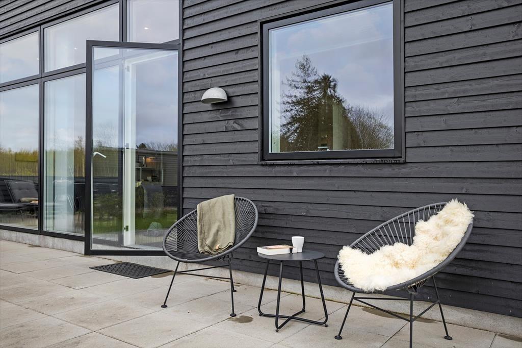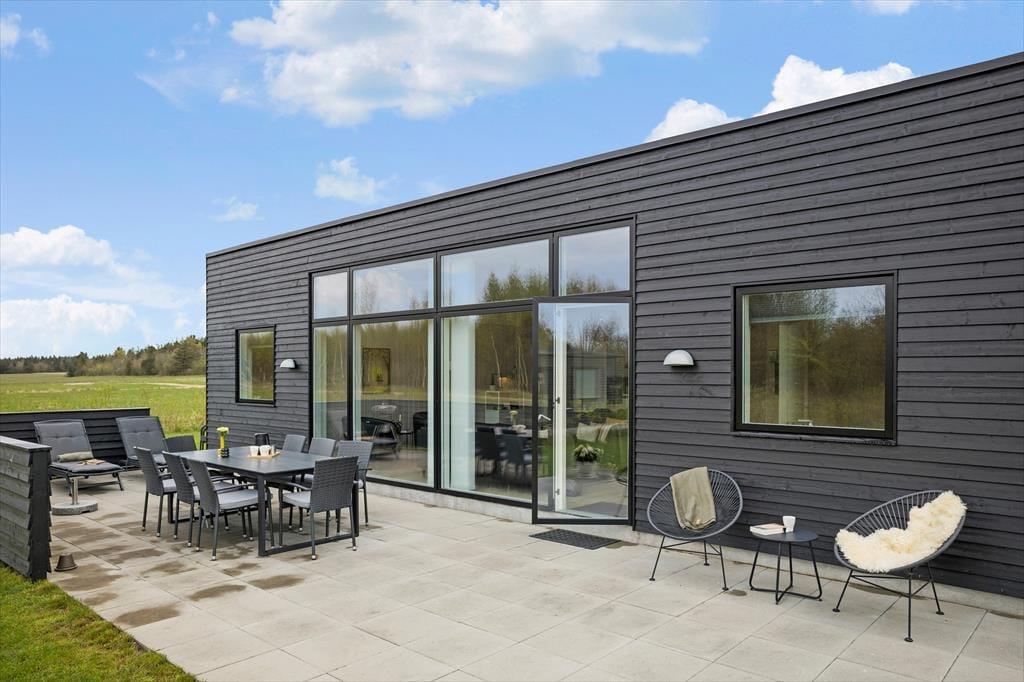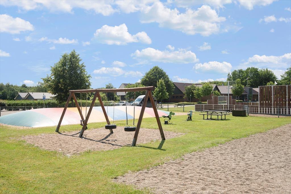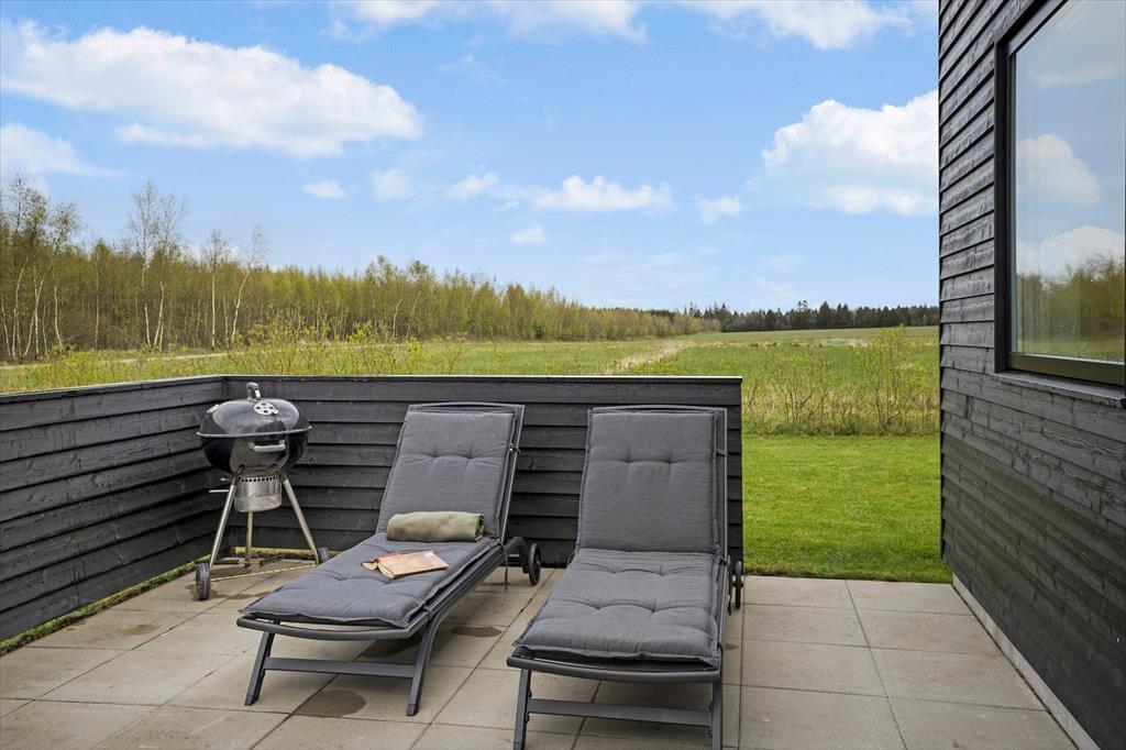 Fra opholdsstuen kan du træde direkte ud på en stor, solrig terrasse med komfortable havemøbler – det ideelle sted til lange grillaftener, morgenkaffe i den friske luft eller stille stunder, hvor du bare nyder udsigten over det åbne landskab. Den store græsplæne indbyder til boldspil, leg og sjov for både børn og voksne, og her kan feriedagene let gå med både afslapning og aktiviteter under åben himmel.