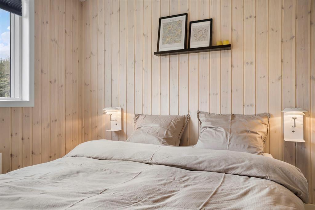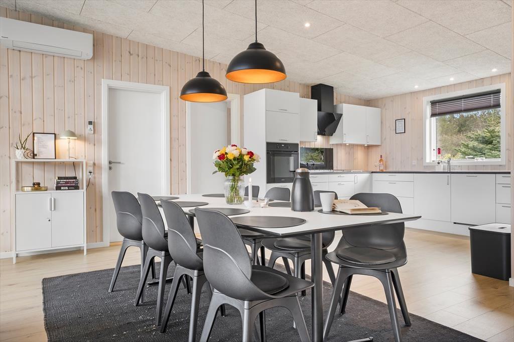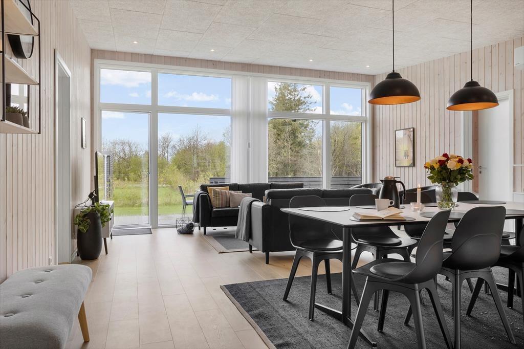 Allerede når du træder ind i huset, fornemmer du den lyse og venlige atmosfære. Det store opholdsrum er domineret af en imponerende vinduesfront, der lukker masser af dagslys ind og giver en følelse af at sidde midt i naturen – som en kæmpestor havestue. Her er køkken, spiseplads og stue samlet i ét, så alle kan være en del af fællesskabet, uanset om du laver mad, spiller spil ved spisebordet eller slapper af i sofahjørnet med en god bog. Køkkenet er usædvanligt rummeligt og fuldt udstyret med alt, hvad hjemmekokken kan ønske sig, så det er en fornøjelse at tilberede alt fra hurtige frokoster til lækre middage efter en dag med dejlige ferieoplevelser.
