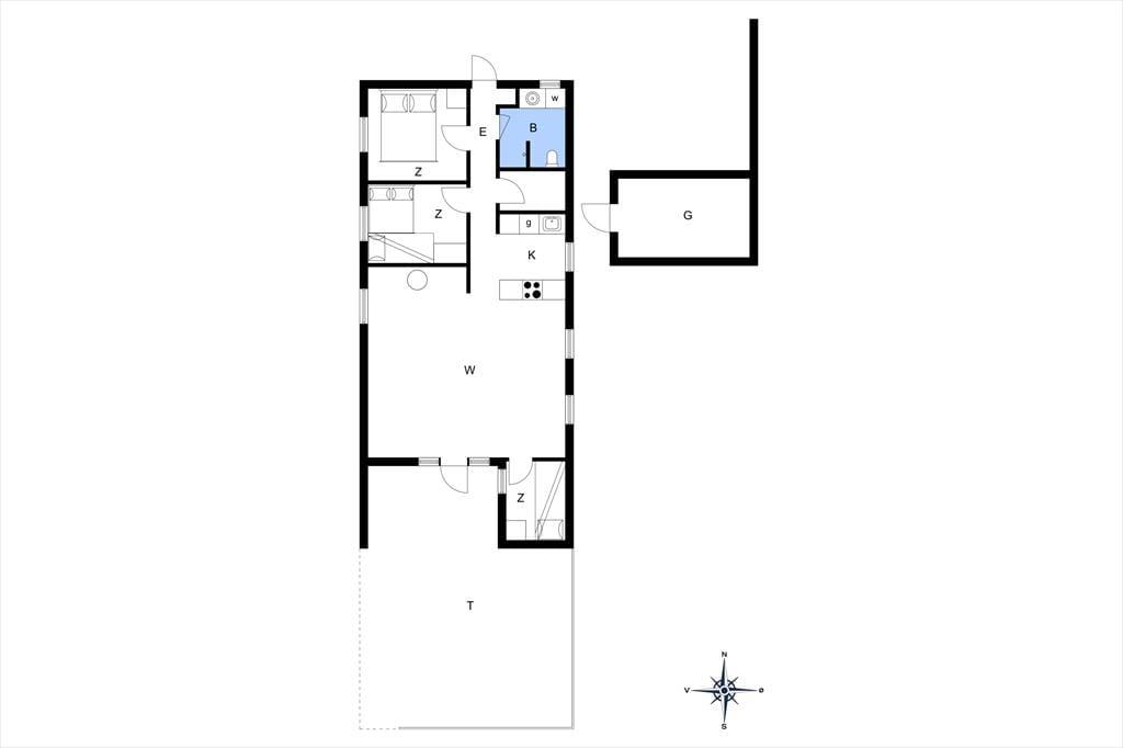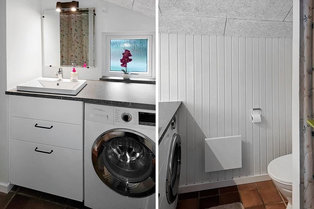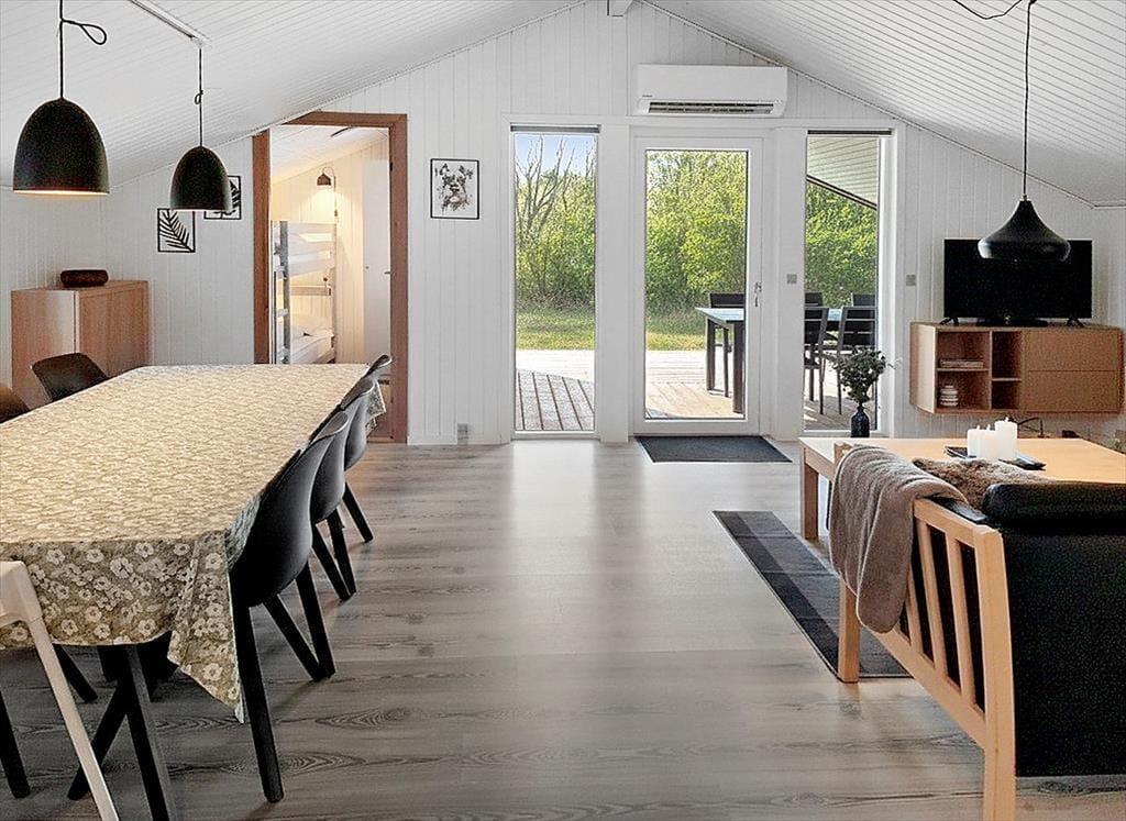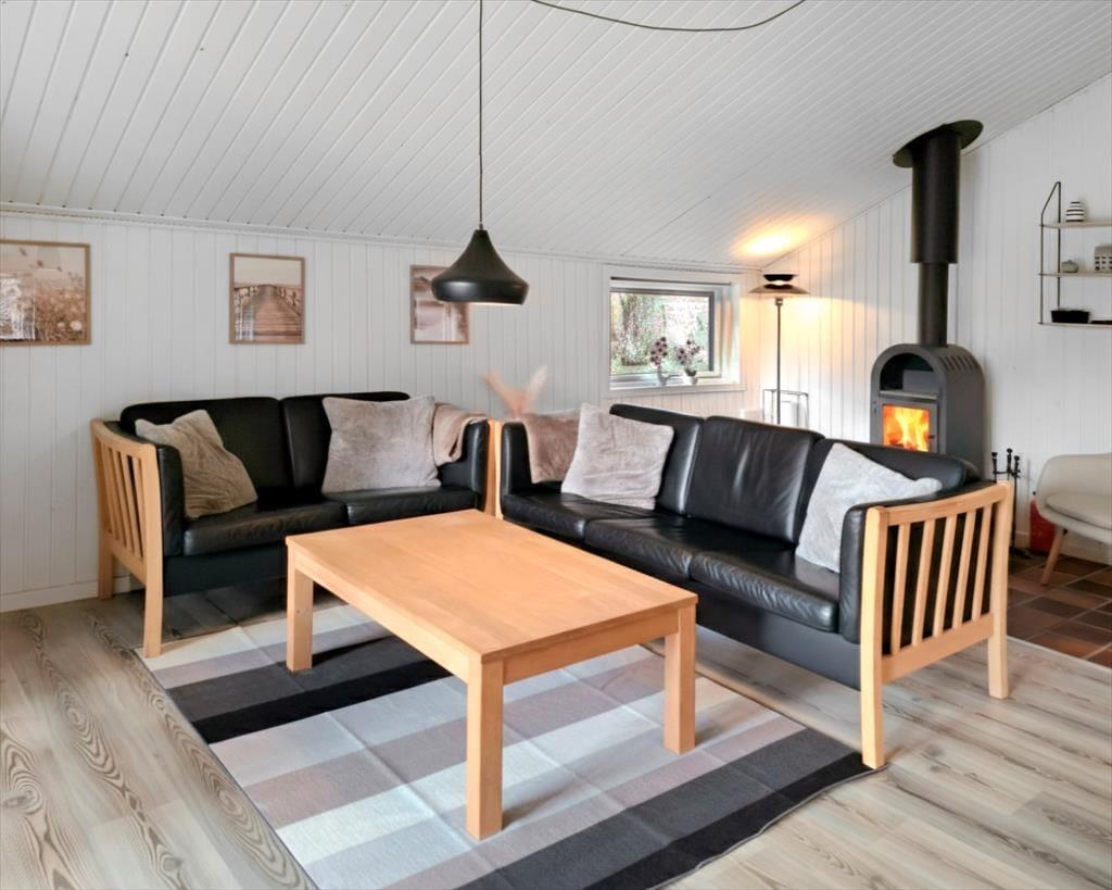 Indenfor bliver du mødt af et lyst og åbent opholdsrum, hvor køkken, spiseplads og stue er samlet i ét. Det giver en behagelig følelse af rummelighed og gør det nemt for hele familien at være sammen, uanset om nogen laver mad, spiller spil eller slapper af. I stuen finder du et hyggeligt sofahjørne foran brændeovnen, der hurtigt skaber varme og en rar atmosfære på kølige dage. Køkkenet er veludstyret med alt, hvad du behøver for at trylle velsmagende retter frem, og opvaskemaskinen sørger for, at oprydningen er hurtigt klaret. Det store spisebord inviterer til fælles måltider og fungerer også perfekt til puslespil eller lange brætspilsaftener, når mørket falder på.