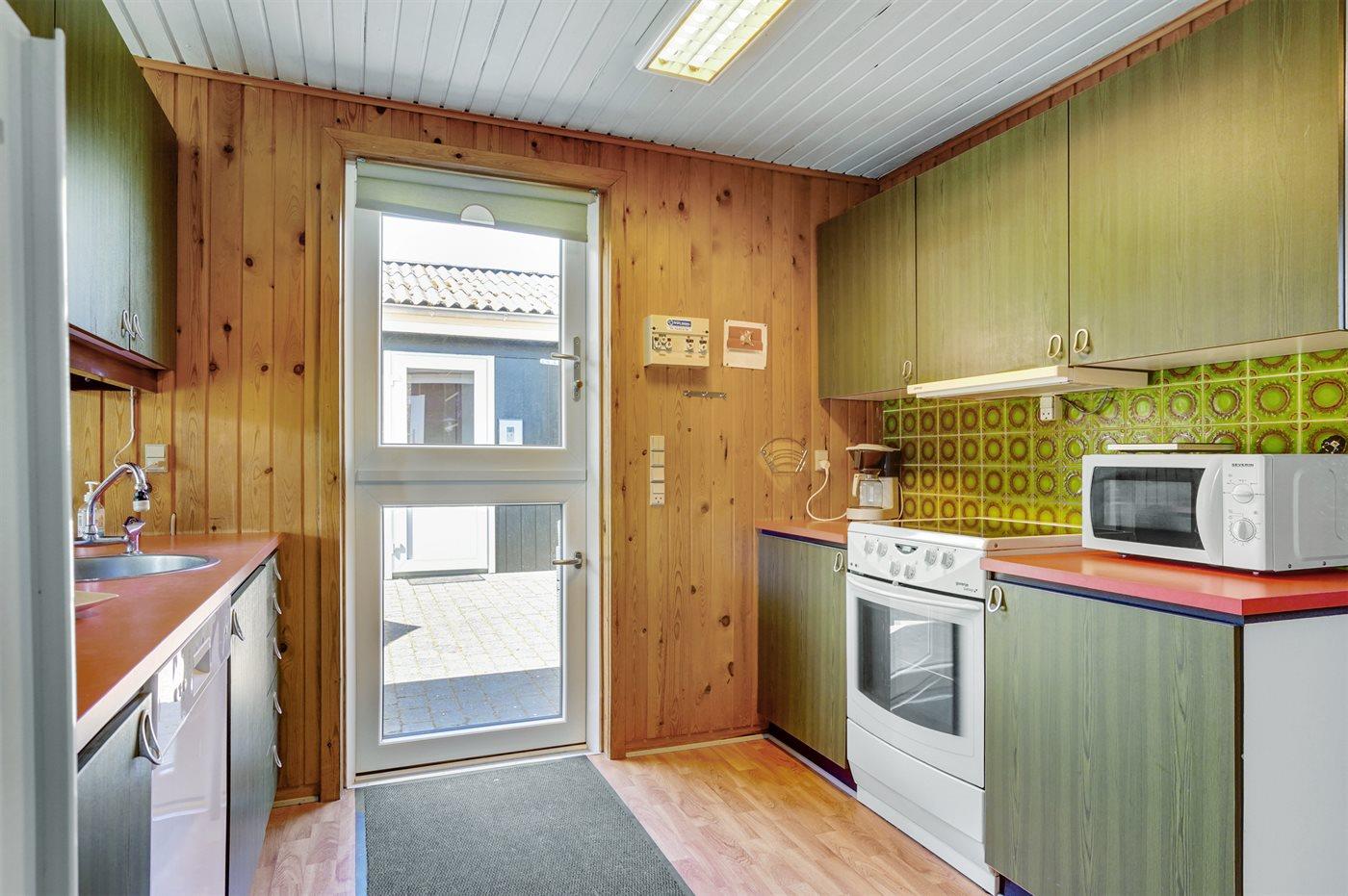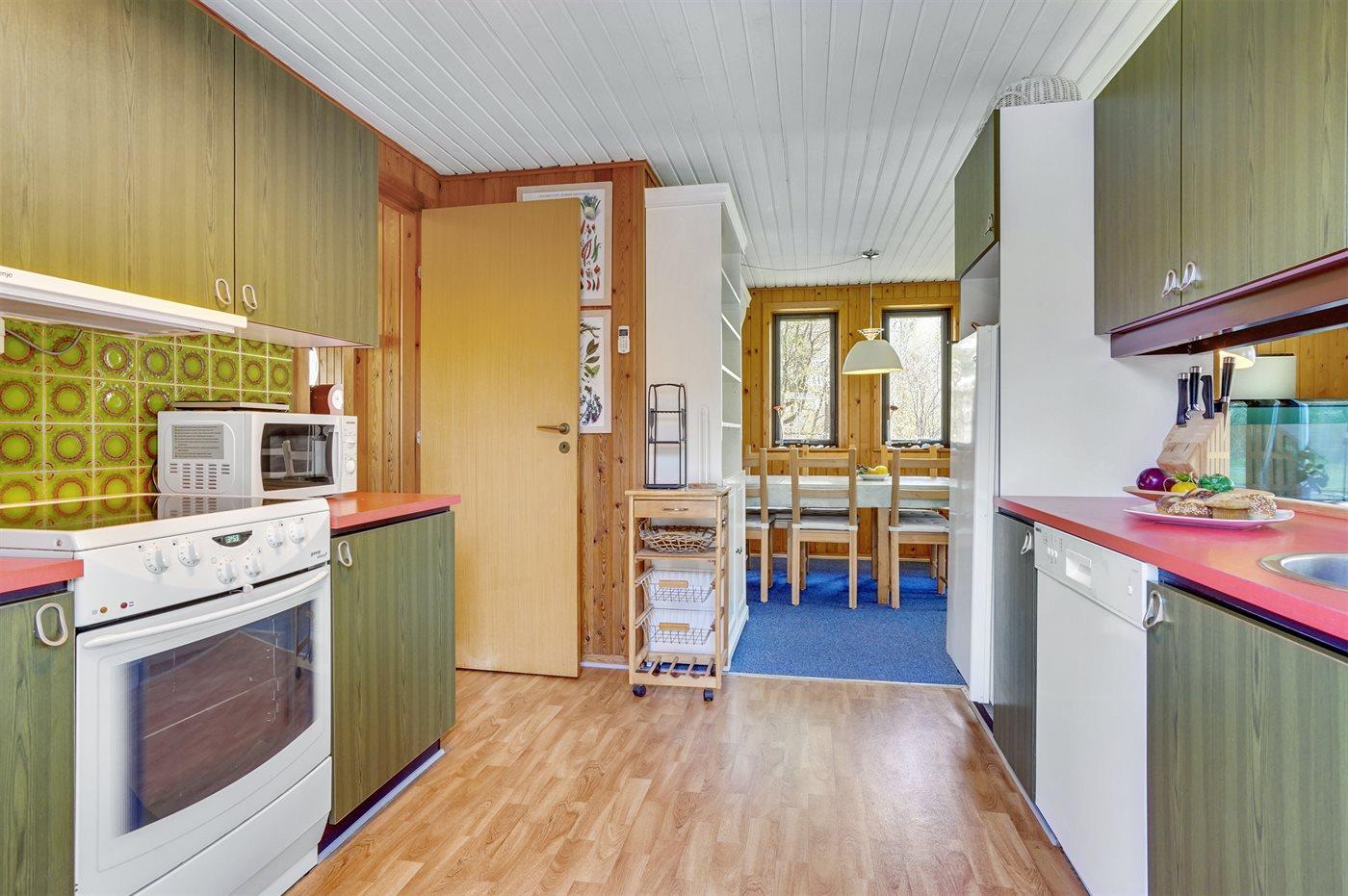 Køkkenet er udstyret med 1 køleskab. Der er 4 keramiske kogeplader, varmluftovn, mikrobølgeovn samt opvaskemaskine.