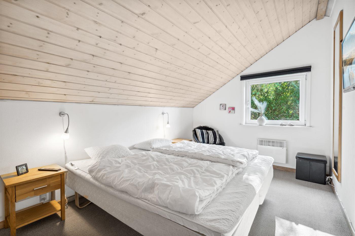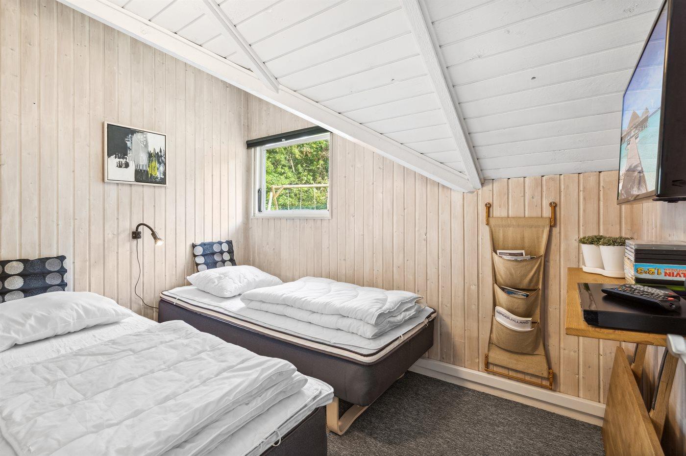 Der er i alt 3 soveværelser. Sovepladserne fordeler sig på: 2 sovepladser i dobbeltseng. 4 sovepladser i enkeltsenge. Derudover er der 1 stk. barneseng.