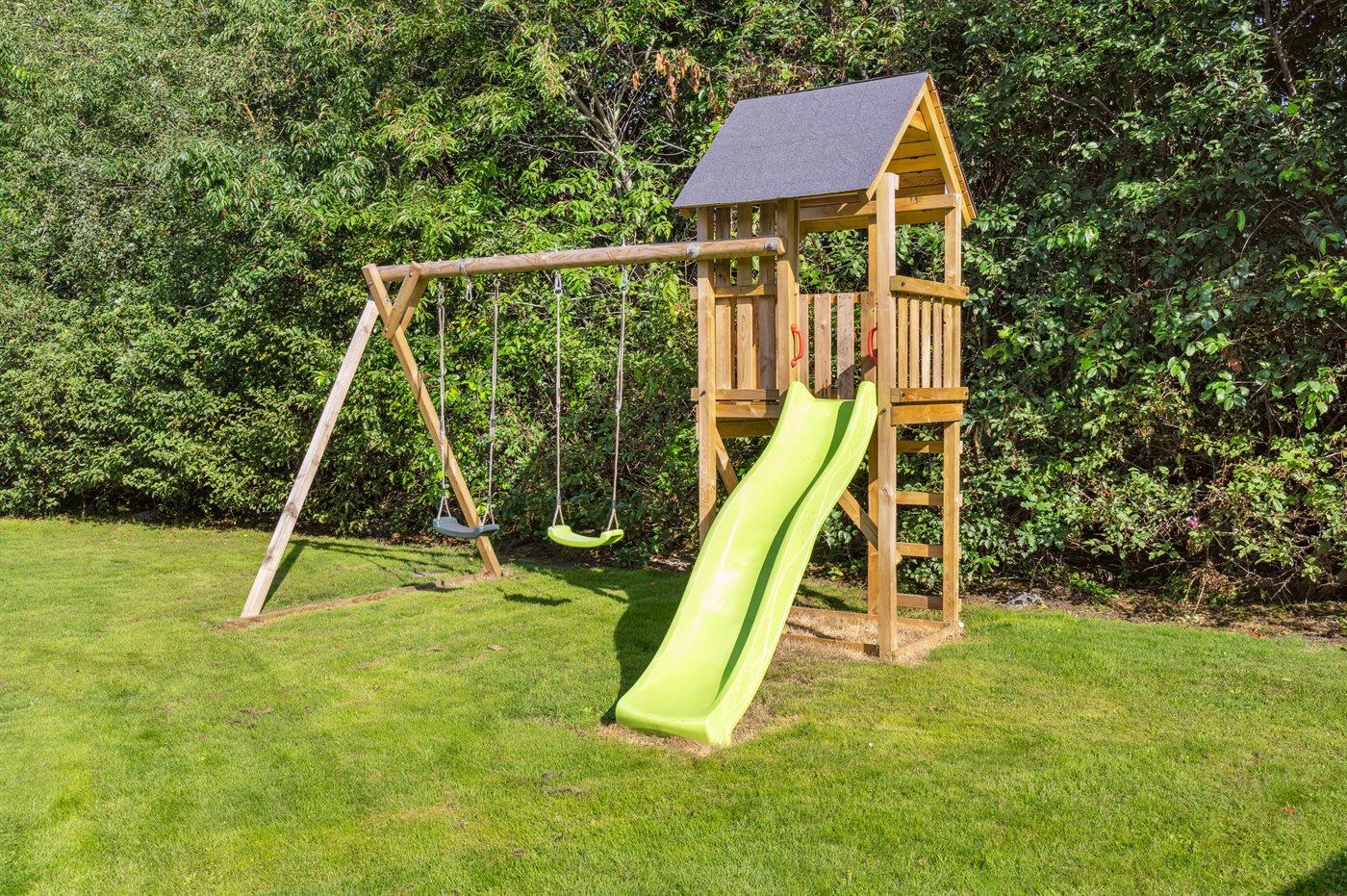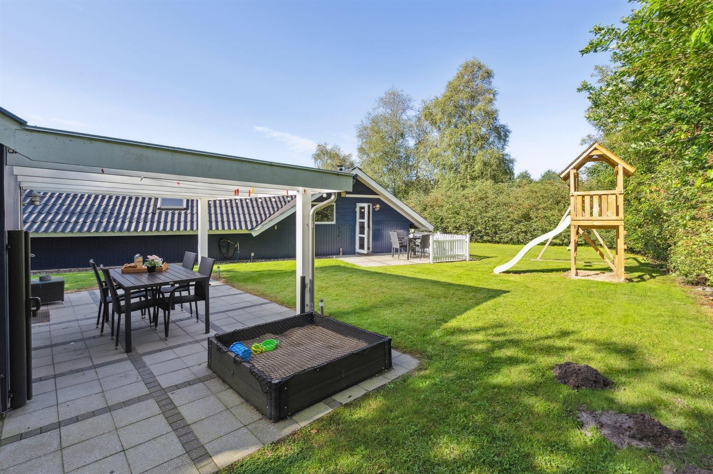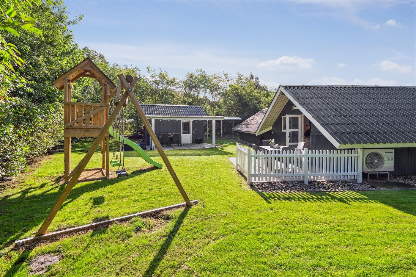 Dette rummelige og lyst indrettede sommerhus ligger på en dejlig grund med plads til boldspil og leg - ikke langt fra en fiskesø og indkøbsmuligheder.