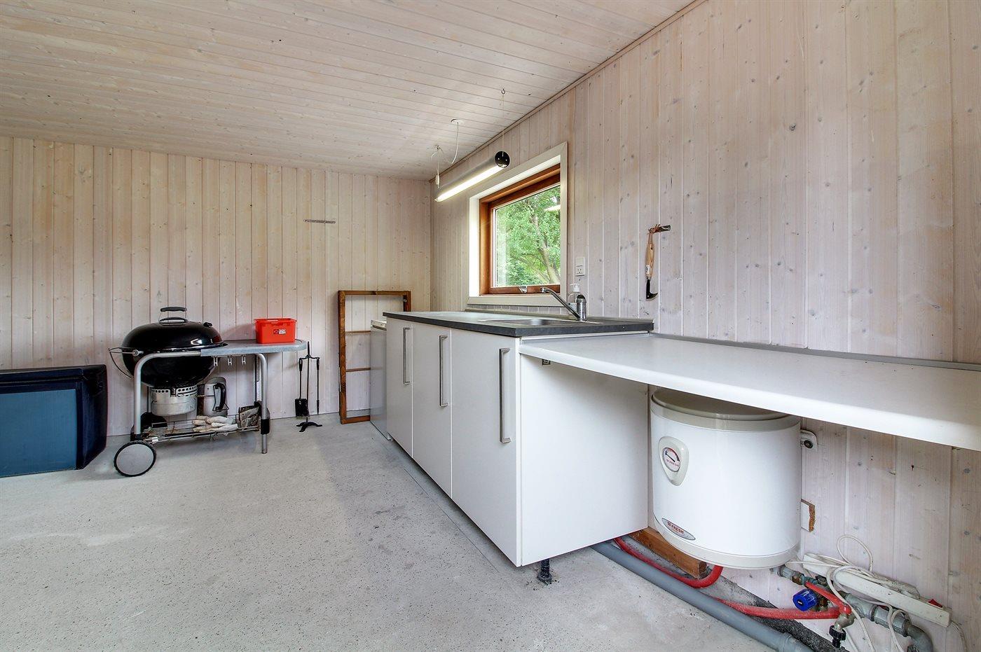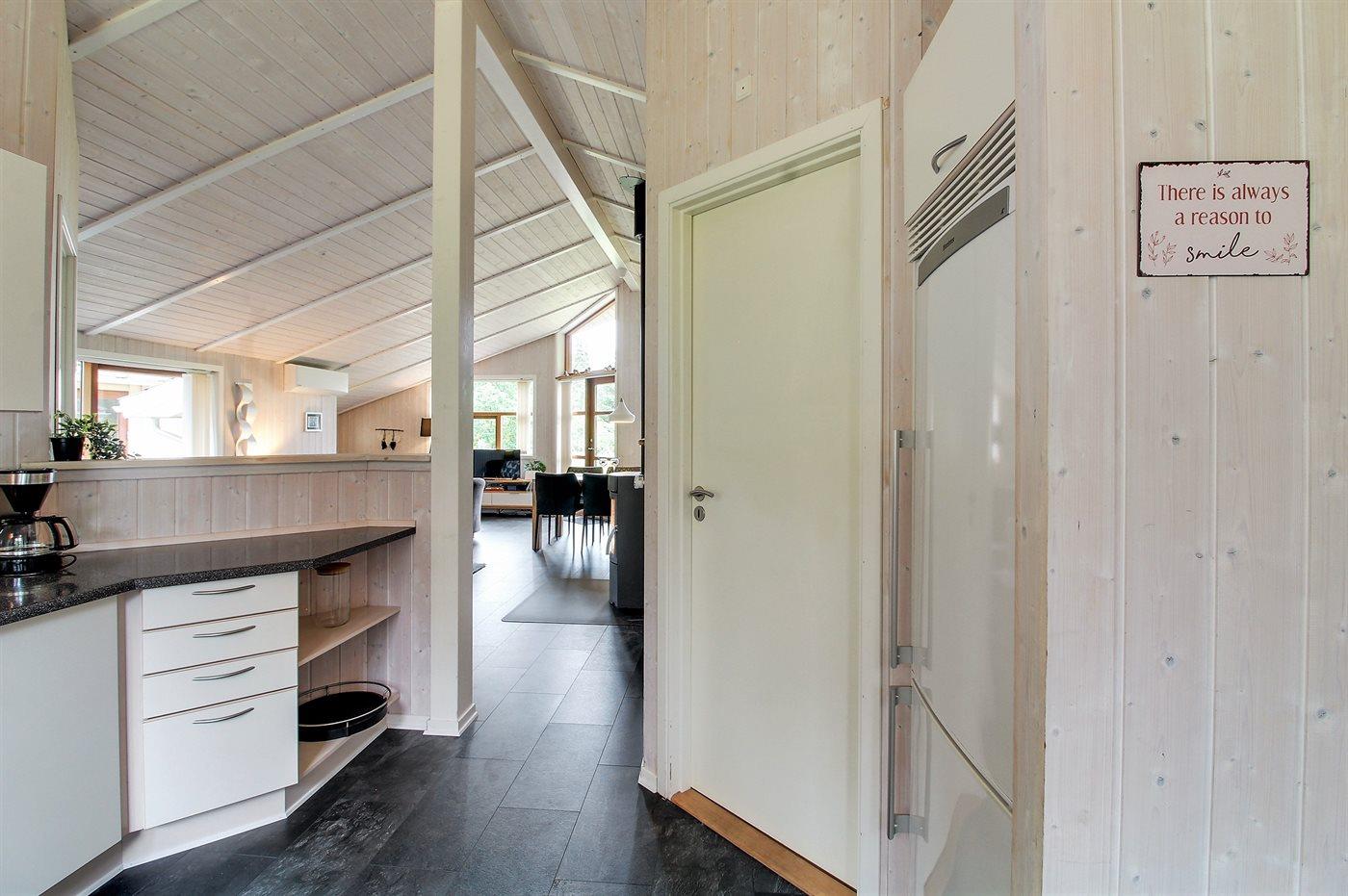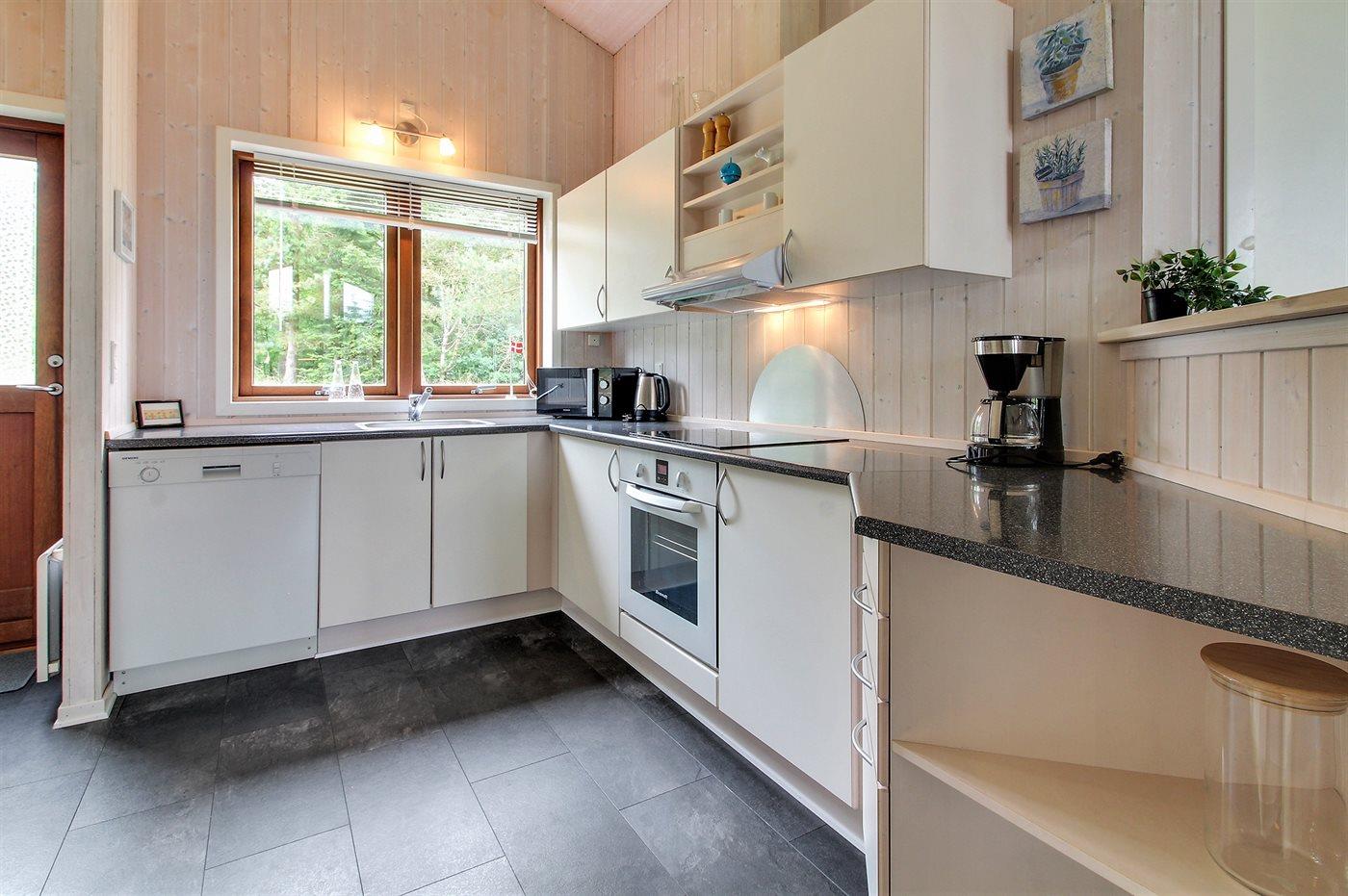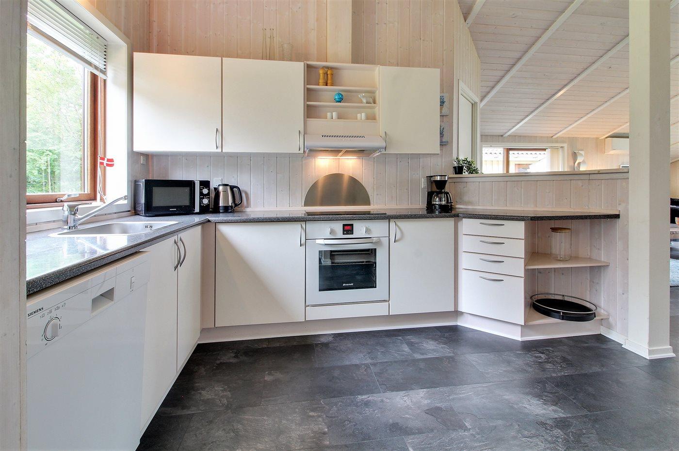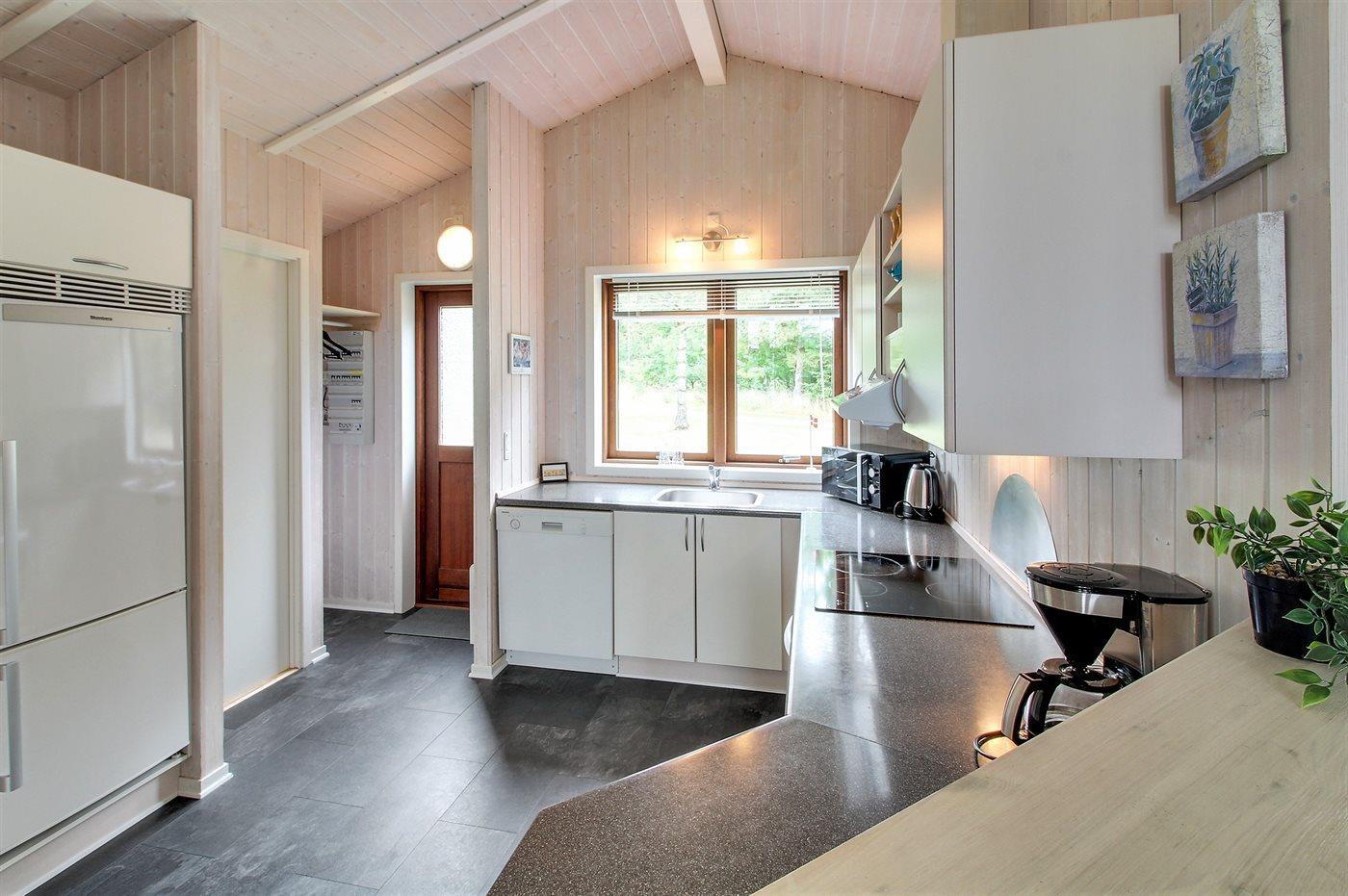 Køkkenet er udstyret med 1 køleskab. Der er 4 keramiske kogeplader, varmluftovn, mikrobølgeovn samt opvaskemaskine.