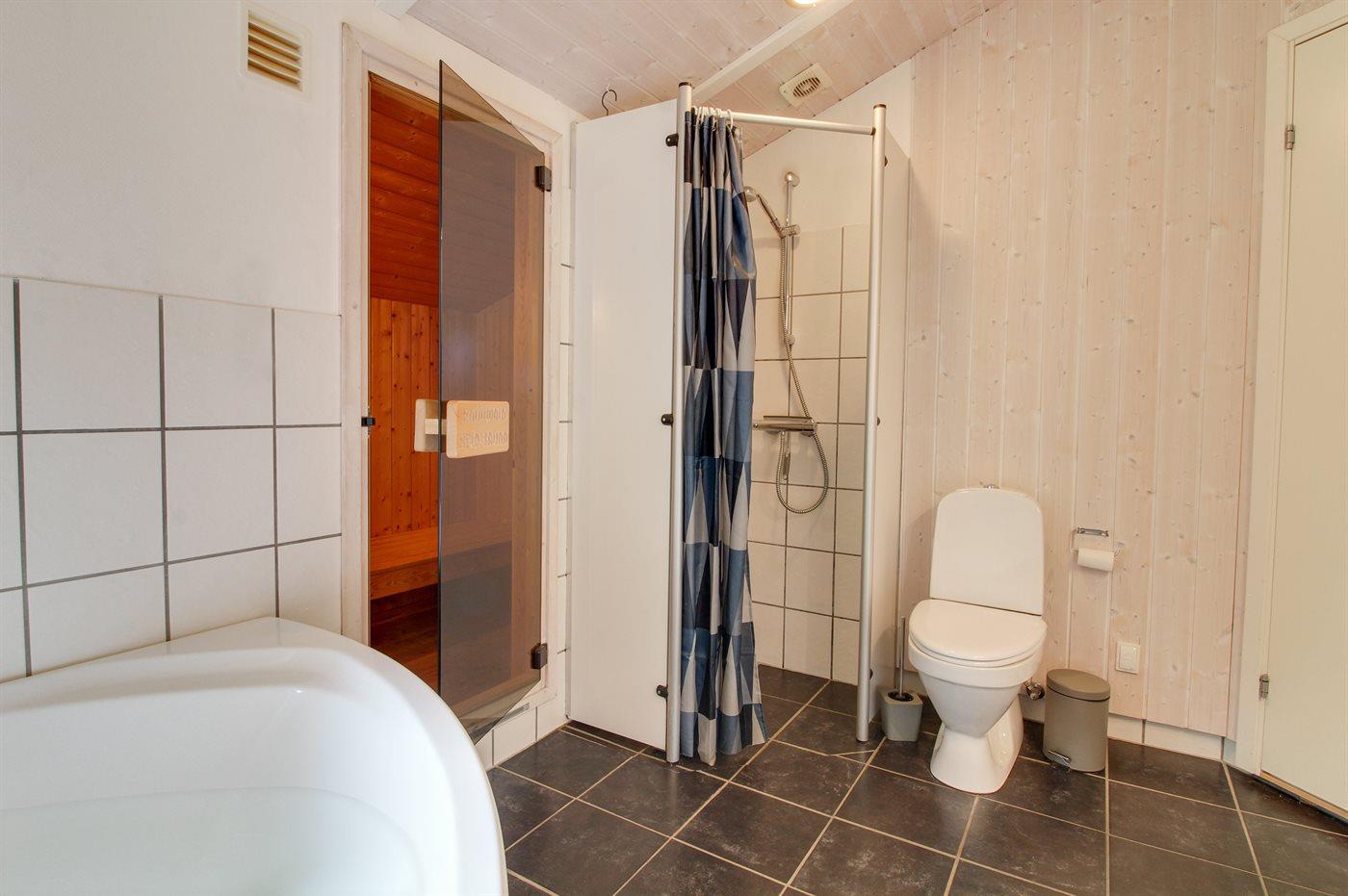 Der er 1 badeværelse med bruseniche og 1 toilet.. Der er gulvvarme på 1 badeværelse. I saunaen er der mulighed for afslapning.