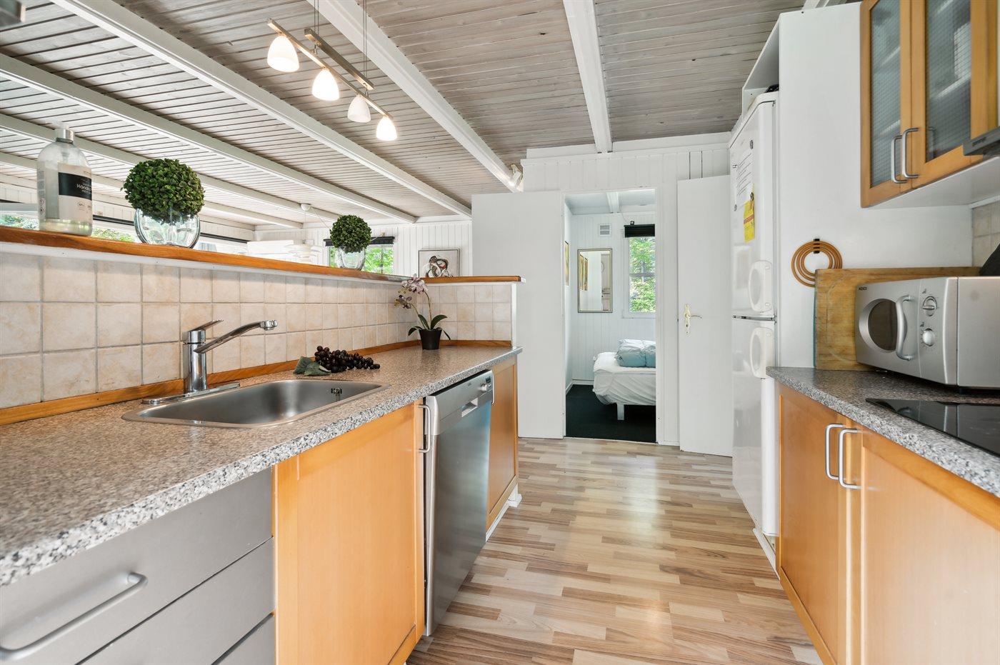Køkkenet er udstyret med 1 køleskab. Der er 4 elkogeplader, bageovn, mikrobølgeovn samt opvaskemaskine.