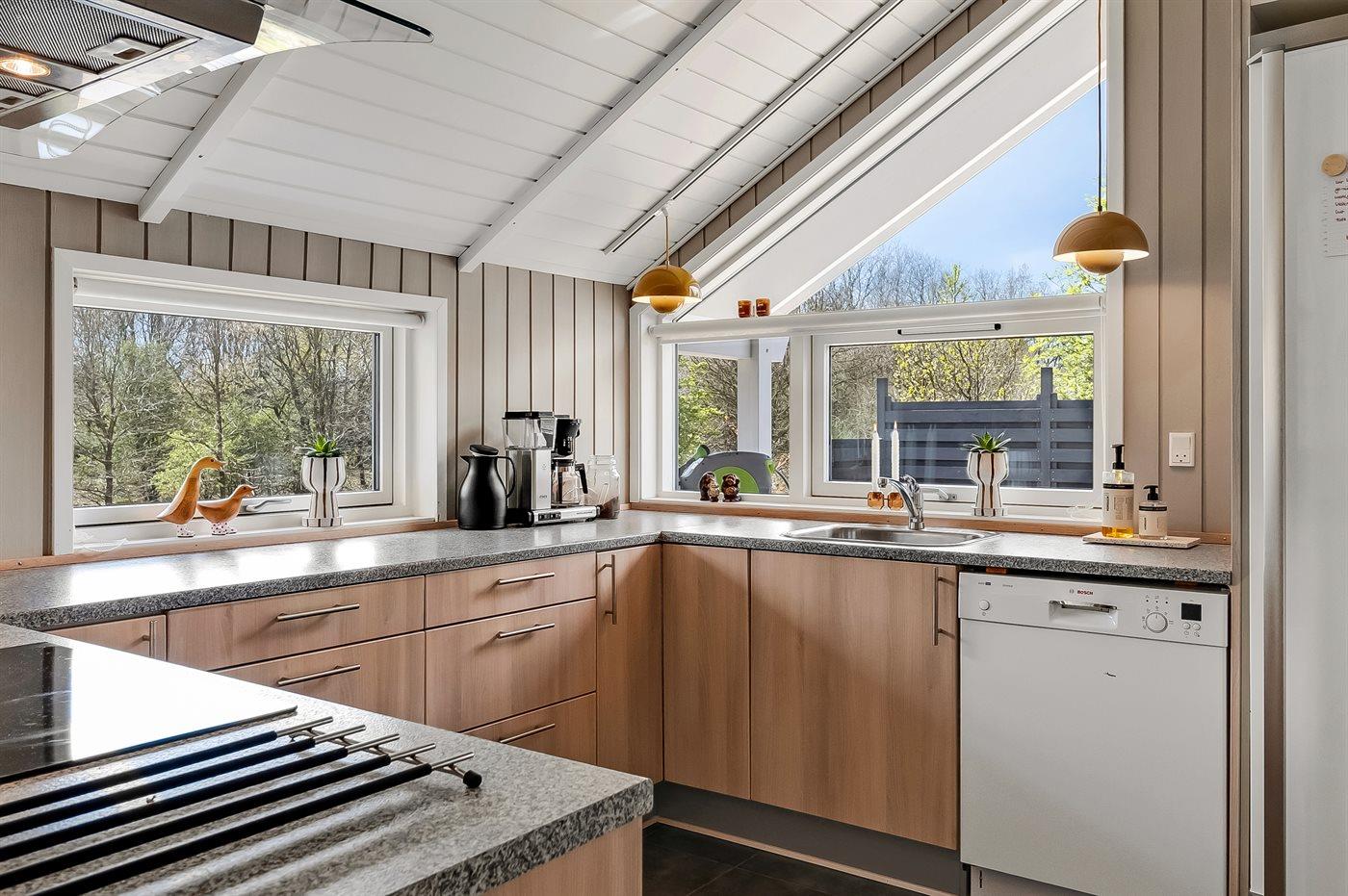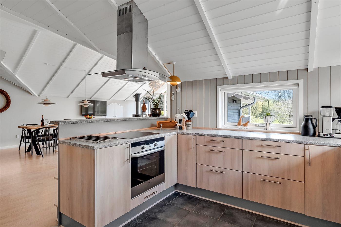 Køkkenet er udstyret med 1 køleskab. Der er 4 keramiske kogeplader, varmluftovn, mikrobølgeovn samt opvaskemaskine.