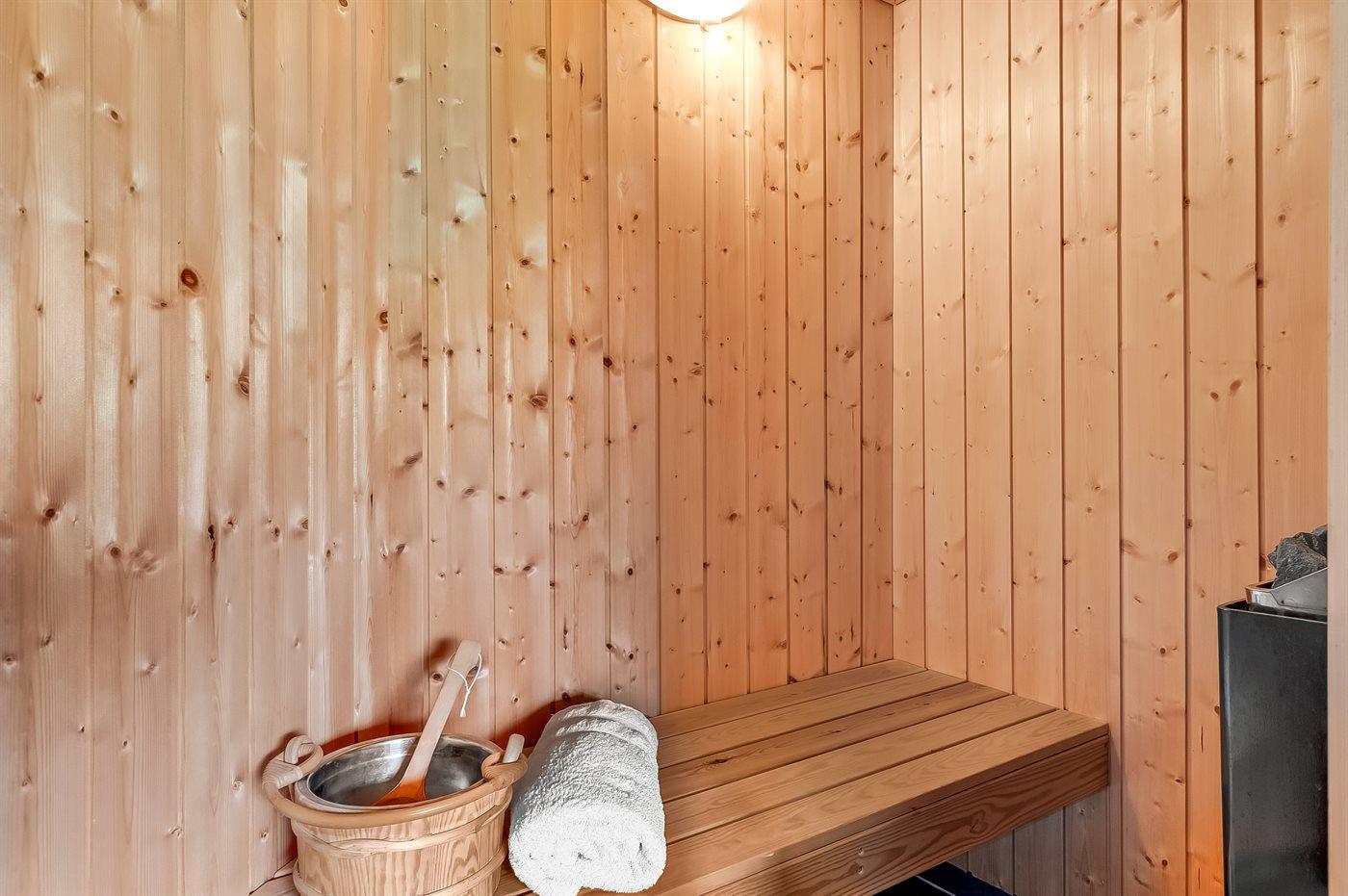 Der er 1 badeværelse med bruseniche og 2 toiletter, heraf 1 gæstetoilet. Der er gulvvarme på 1 badeværelse. Der er gulvvarme på gæstetoilettet. I saunaen er der mulighed for afslapning.
