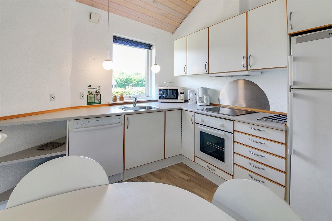 Køkkenet er udstyret med 1 køleskab. Der er 4 keramiske kogeplader, varmluftovn, mikrobølgeovn samt opvaskemaskine.
