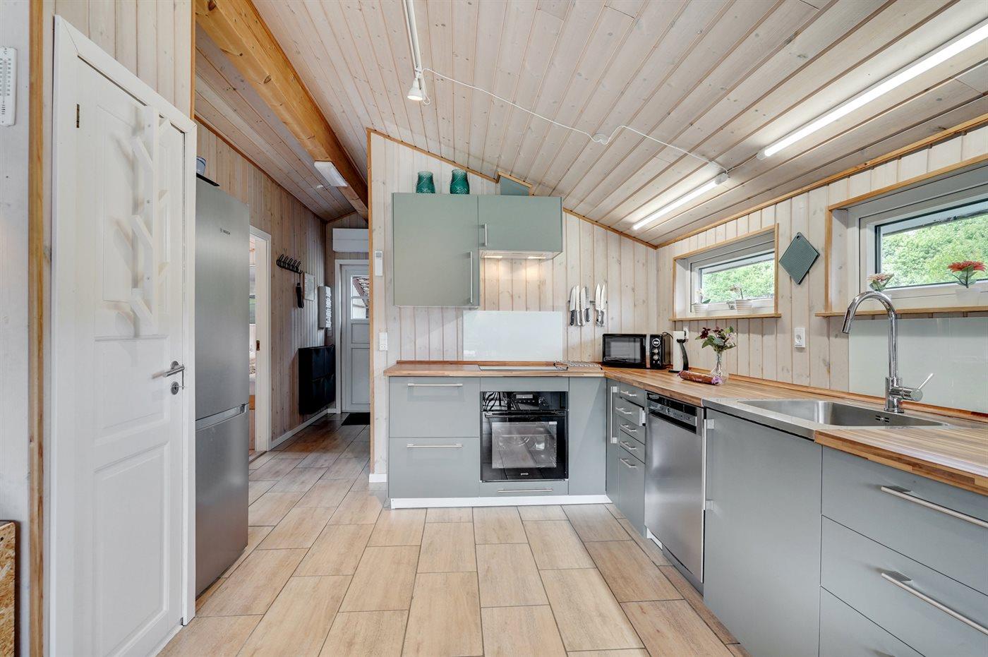 Køkkenet er udstyret med 1 køleskab. Der er 4 induktionskogeplader, varmluftovn, mikrobølgeovn samt opvaskemaskine.