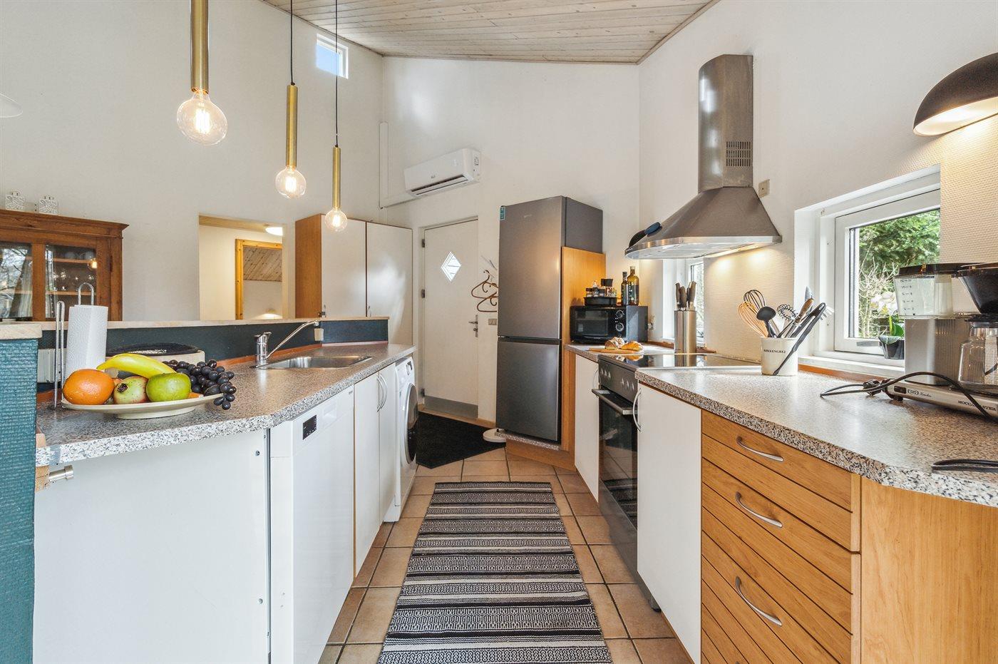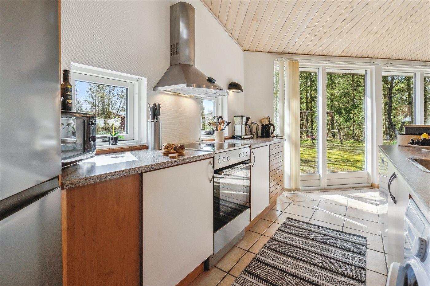 Køkkenet er udstyret med 1 køleskab. Der er 4 keramiske kogeplader, bageovn, varmluftovn, mikrobølgeovn samt opvaskemaskine.