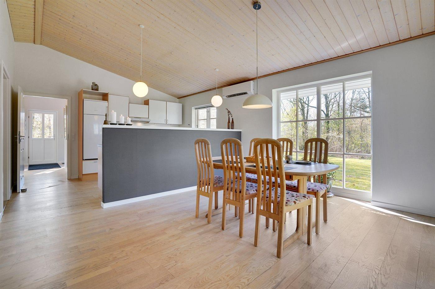 Køkkenet er udstyret med 1 køleskab. Der er 4 keramiske kogeplader, bageovn, mikrobølgeovn samt opvaskemaskine.