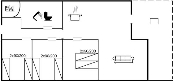 Der er i alt 3 soveværelser. Sovepladserne fordeler sig på: 2 sovepladser i dobbeltseng. 4 sovepladser i enkeltsenge.