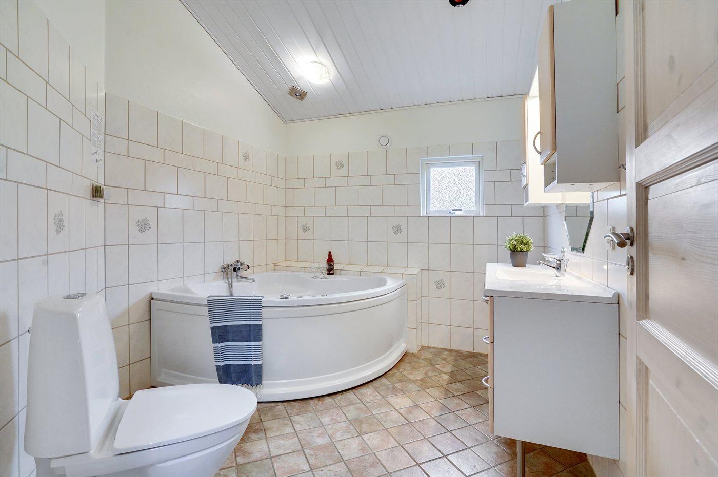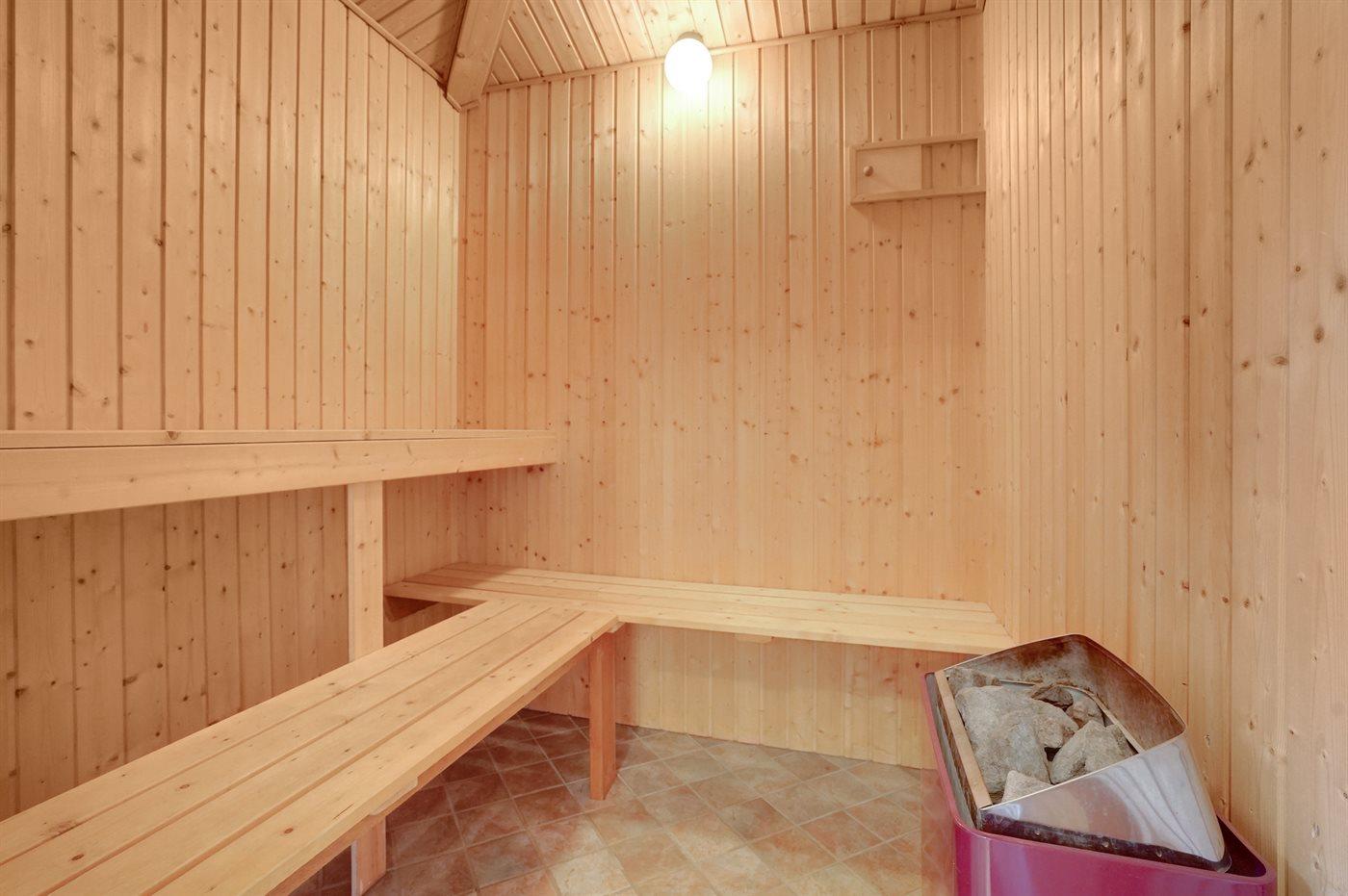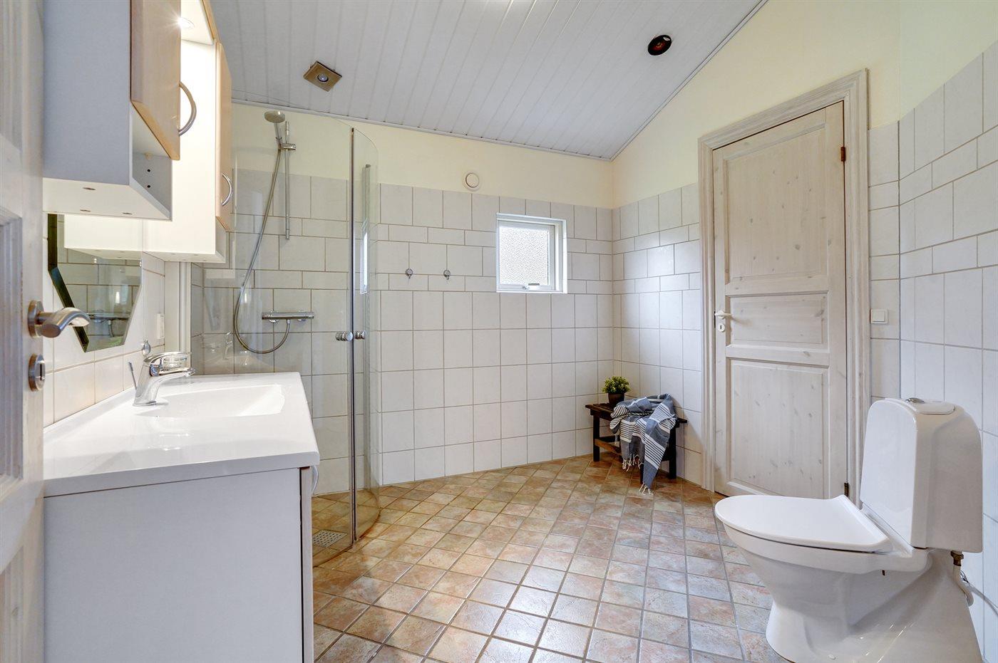 Der er 2 badeværelser med bruseniche og 2 toiletter. Der er gulvvarme på 1 badeværelse. I saunaen er der mulighed for afslapning.