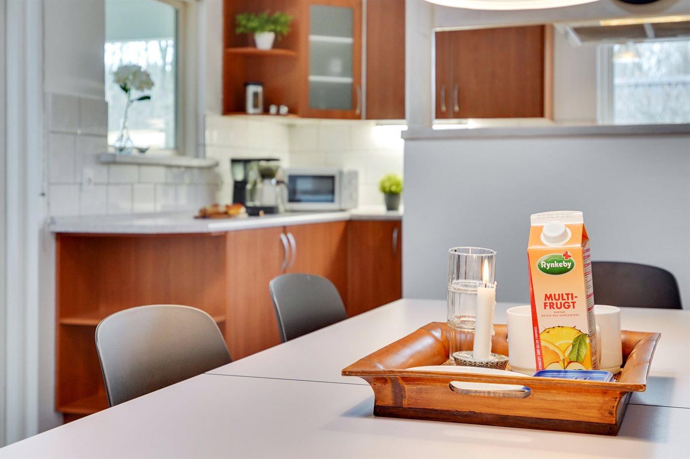 Køkkenet er udstyret med 1 køleskab. Der er 4 keramiske kogeplader, varmluftovn, mikrobølgeovn samt opvaskemaskine.