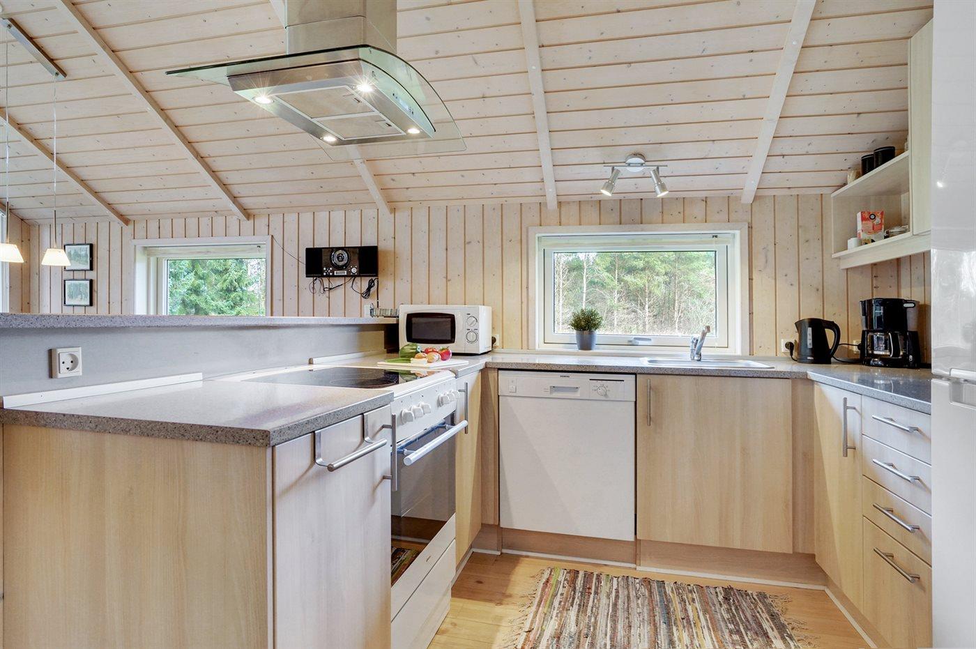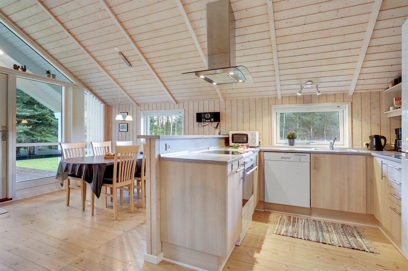 Køkkenet er udstyret med 1 køleskab. Der er 4 keramiske kogeplader, varmluftovn, mikrobølgeovn samt opvaskemaskine.