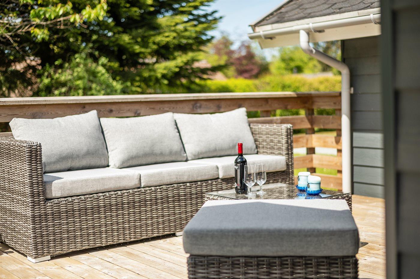Flot sommerhus i rolige omgivelser med stor terrasse og plads til husdyr nær Arrild i Toftlund.