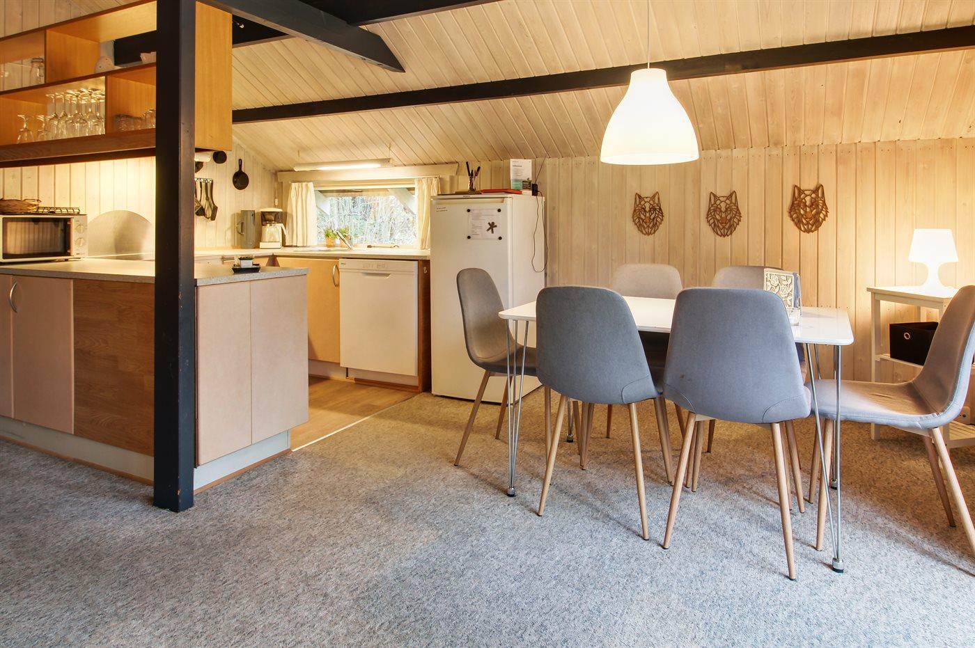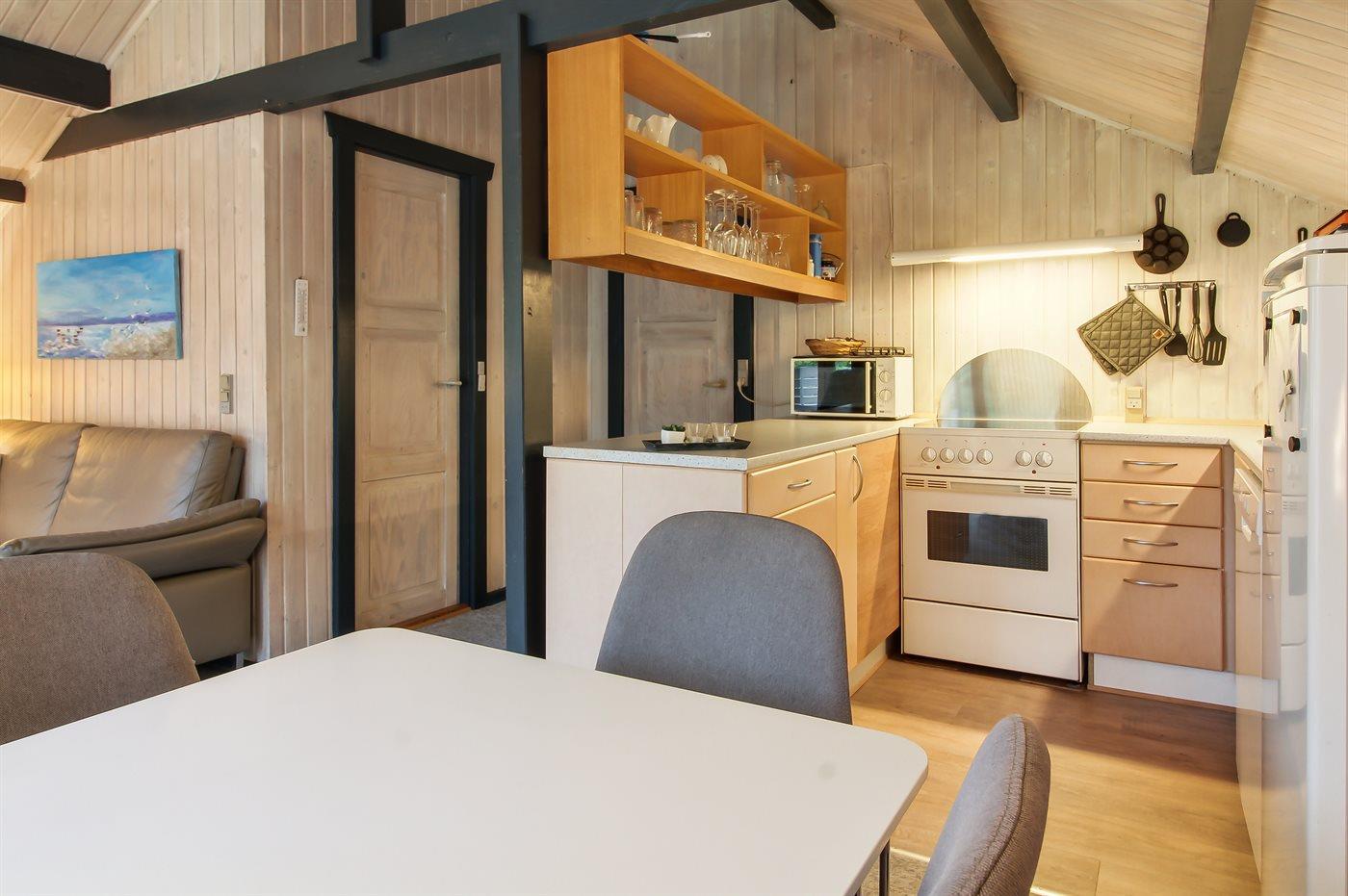 Køkkenet er udstyret med 1 køleskab. Der er 4 keramiske kogeplader, varmluftovn, mikrobølgeovn samt opvaskemaskine.