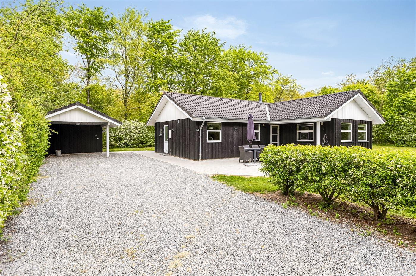 Et sommerhus, som ligger på en 1200 m2 stor grund med god plads til boldspil og leg samt sandkasse og legeredskaber. Huset er indrettet med to soveafdelinger med hver deres badeværelse, hvoraf det ene er velegnet til kørestolsbrugere. Hver soveafdeling kan lukkes med en skydedør og dermed adskilles fra det store køkken/opholdsrum. Til huset hører en dejlig stor terrasse, hvor der er sol fra morgen til aften.
