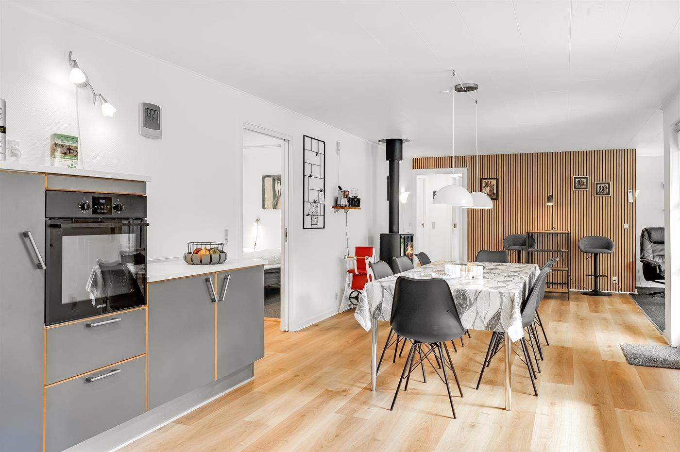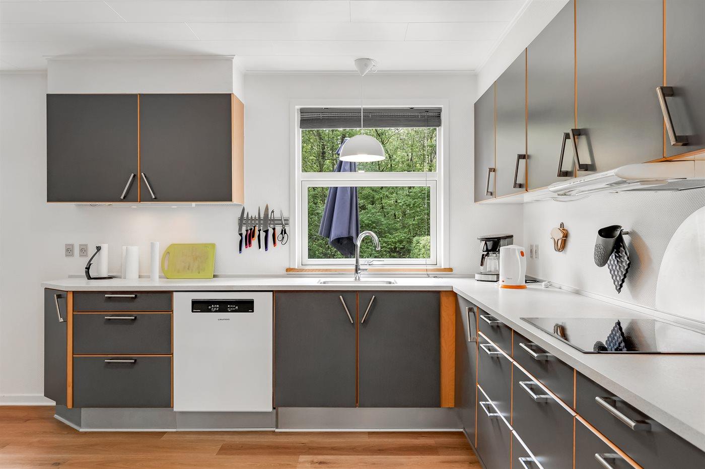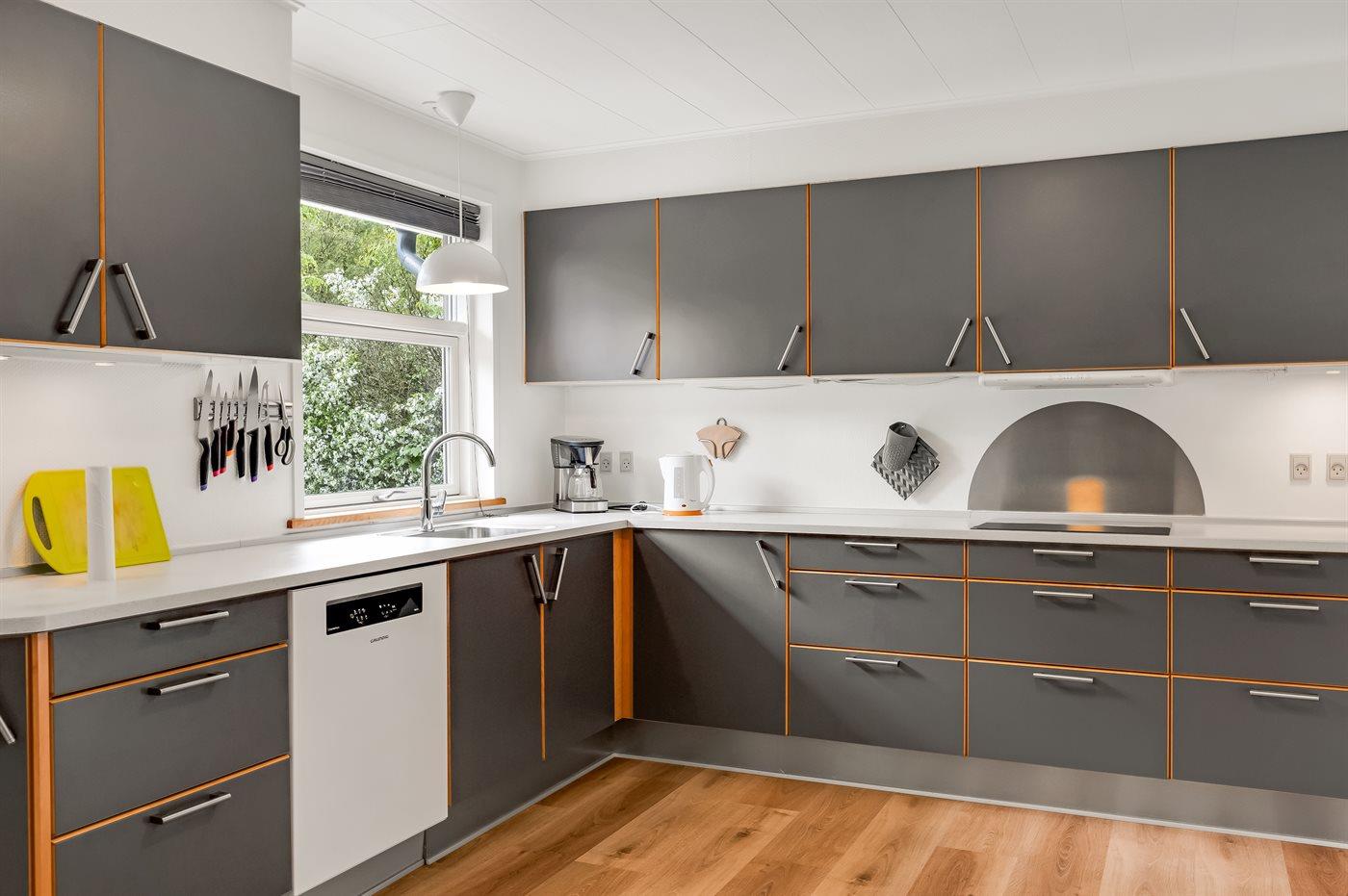 Køkkenet er udstyret med 1 køleskab. Der er 4 keramiske kogeplader, varmluftovn, mikrobølgeovn samt opvaskemaskine Der er gulvvarme i køkkenet.