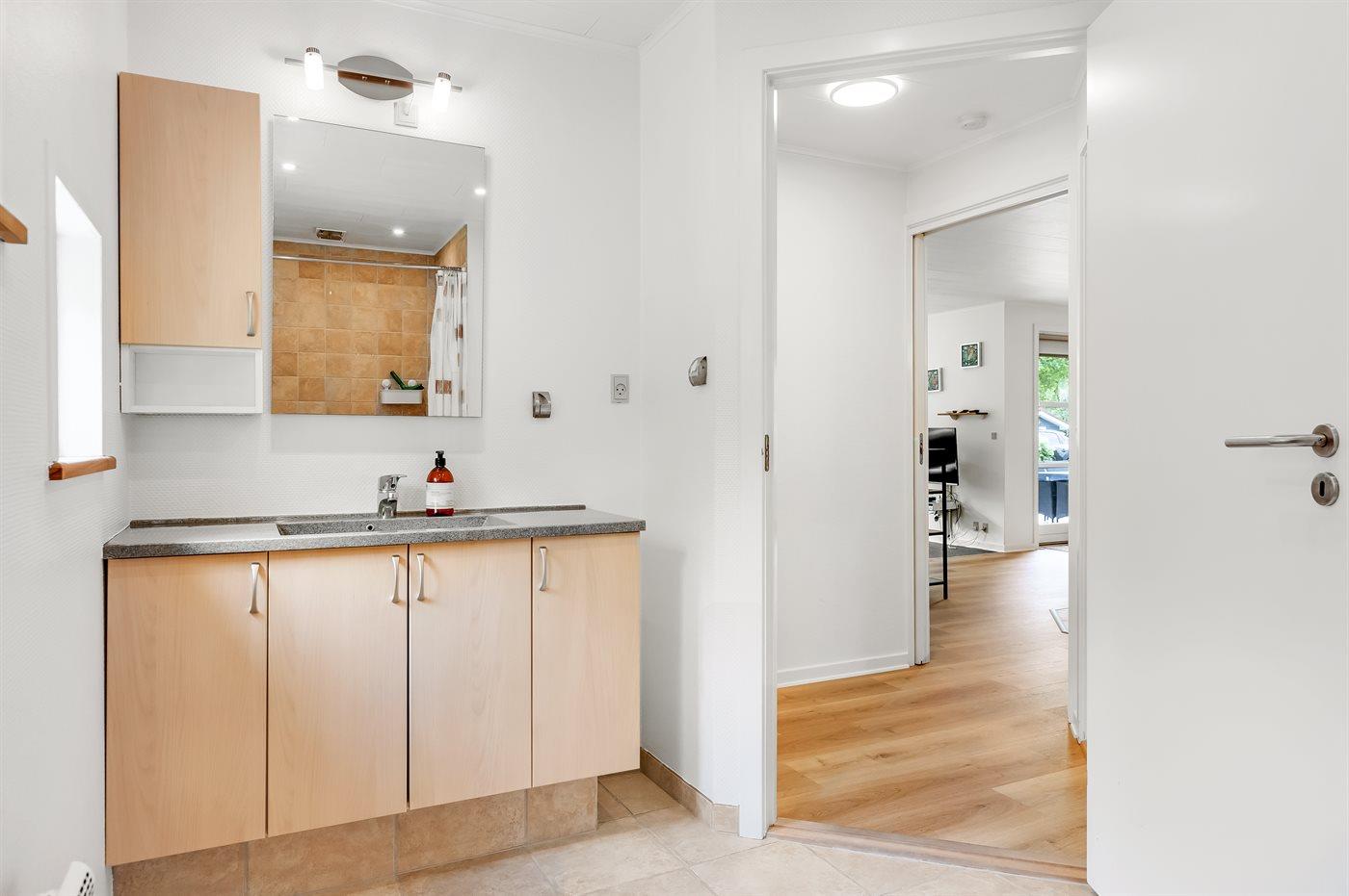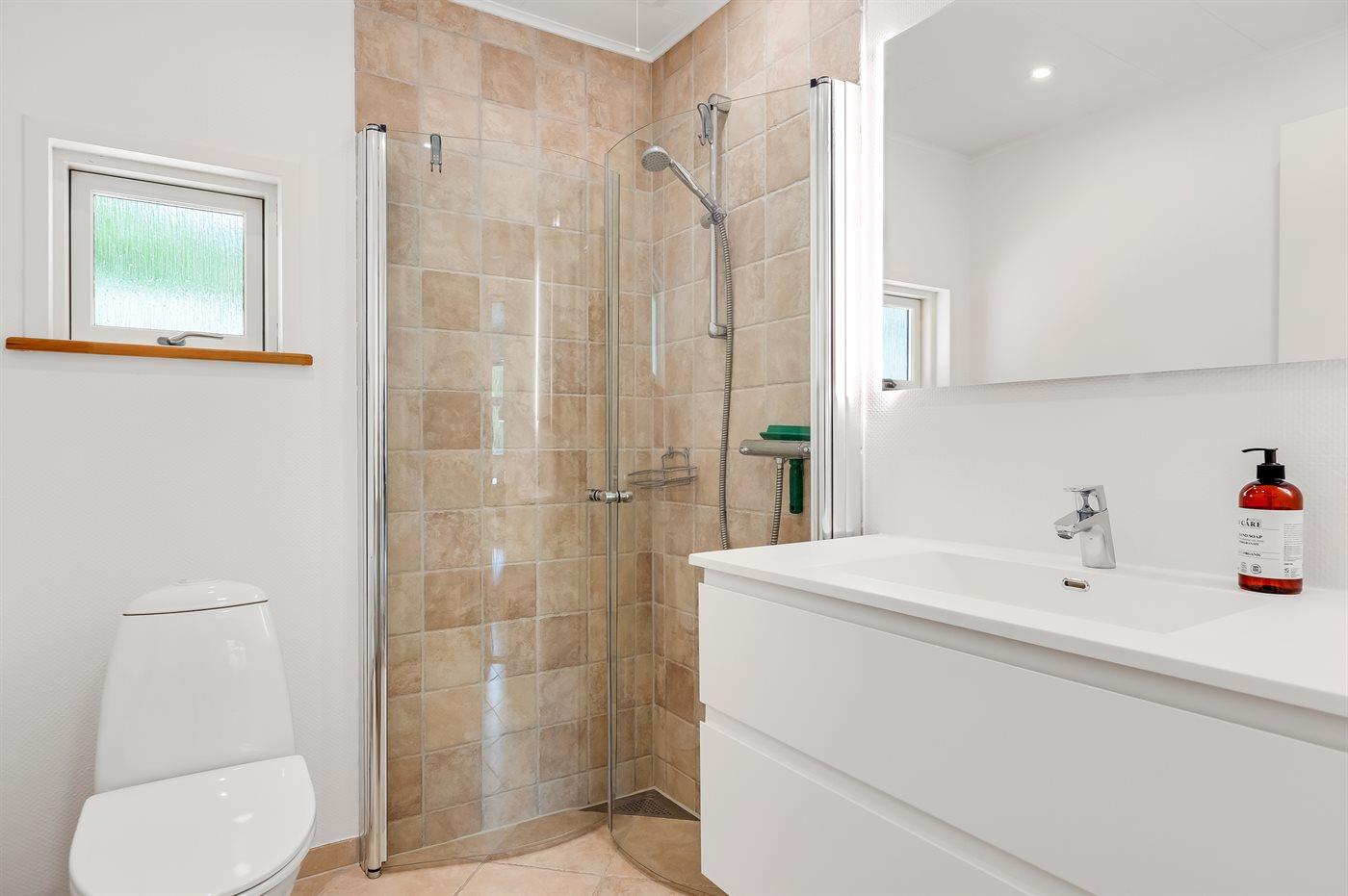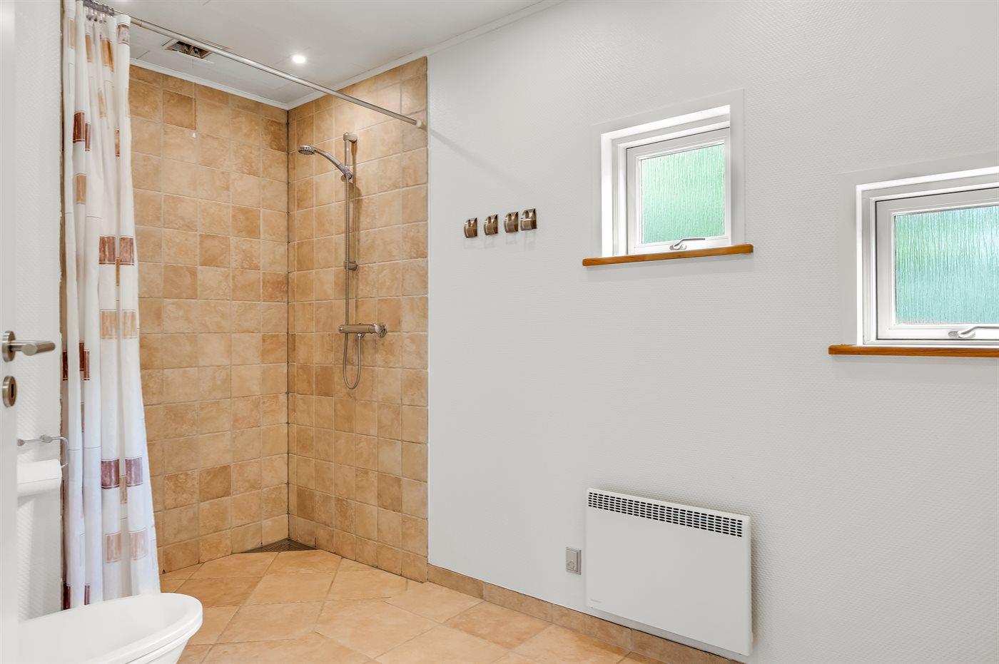 Der er 2 badeværelser med bruseniche. Der er gulvvarme på 2 badeværelser.