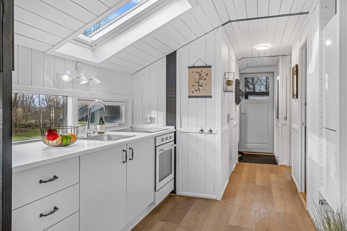 Køkkenet er udstyret med 1 køleskab. Der er 4 keramiske kogeplader, varmluftovn, mikrobølgeovn.