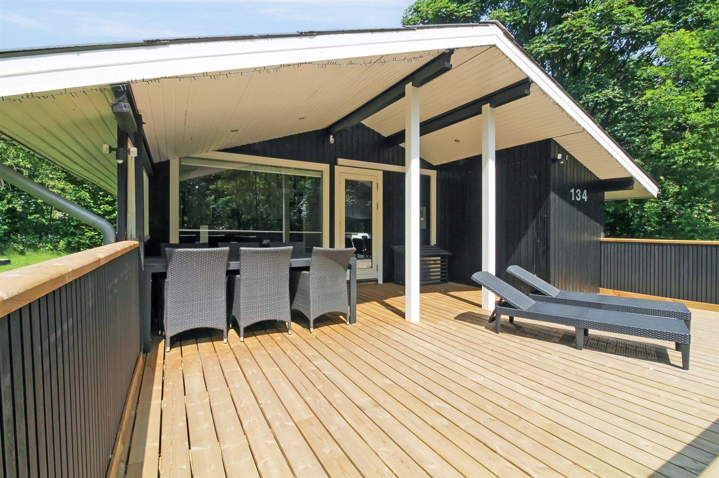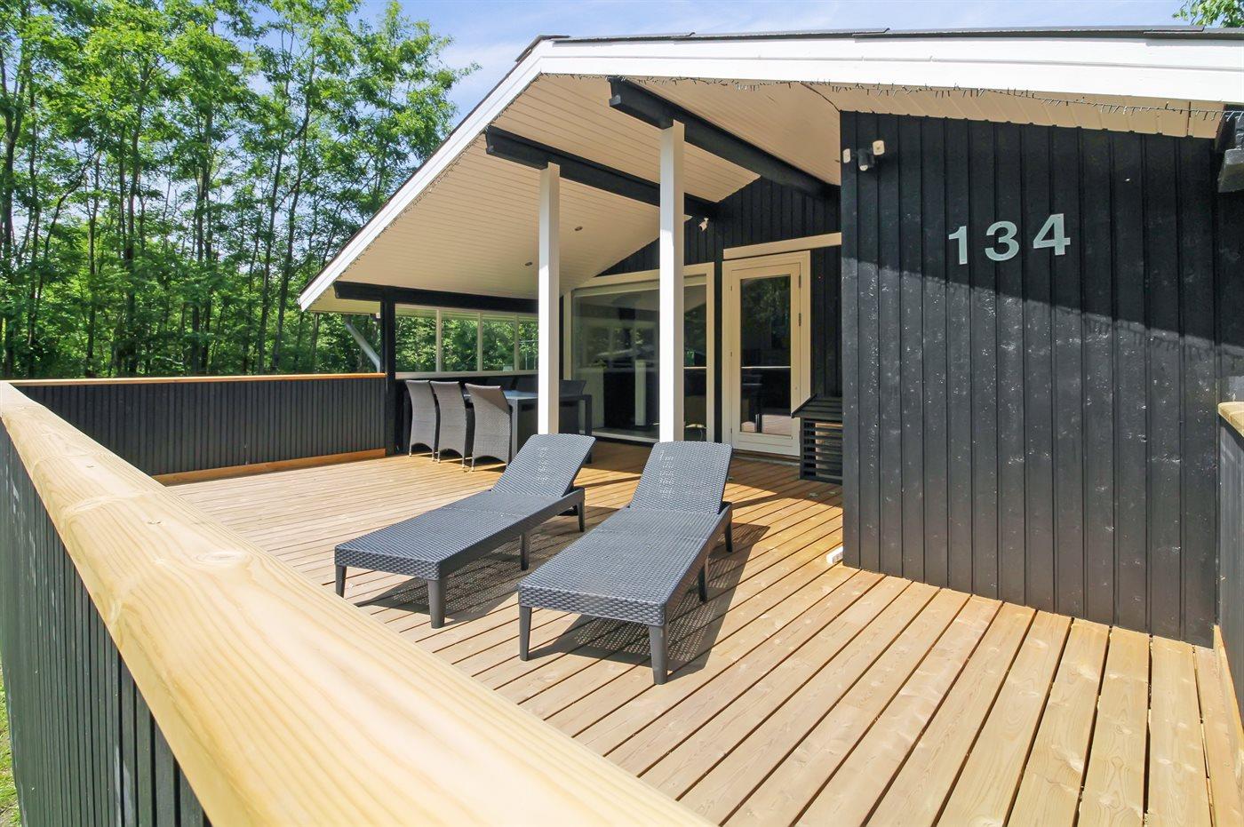 Udenfor finder du en ekstra stor træterrasse med komfortable solvogne. Her kan du nyde solen, spise dagens måltider i det fri eller bare læne dig tilbage og lade stilheden sænke sig. Bord og stole kan let flyttes, så du altid kan finde en plads i solen eller skyggen. Sommerens hyggelige aftener bliver ekstra skønne ved den nyetablerede grillplads med grillbord – perfekt til lange middage under åben himmel.