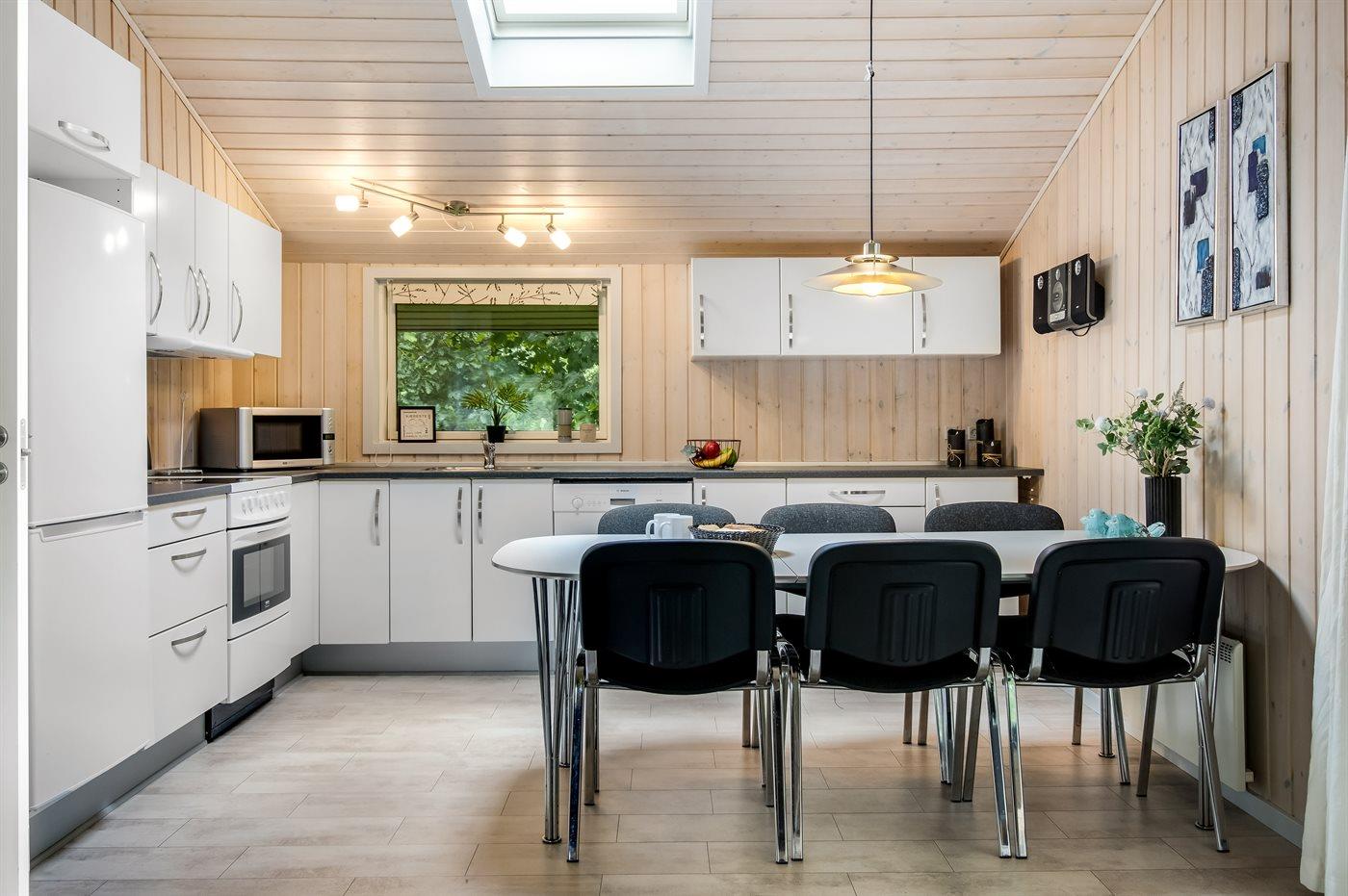 Køkkenet er udstyret med 1 køleskab. Der er 4 keramiske kogeplader, varmluftovn, mikrobølgeovn samt opvaskemaskine.