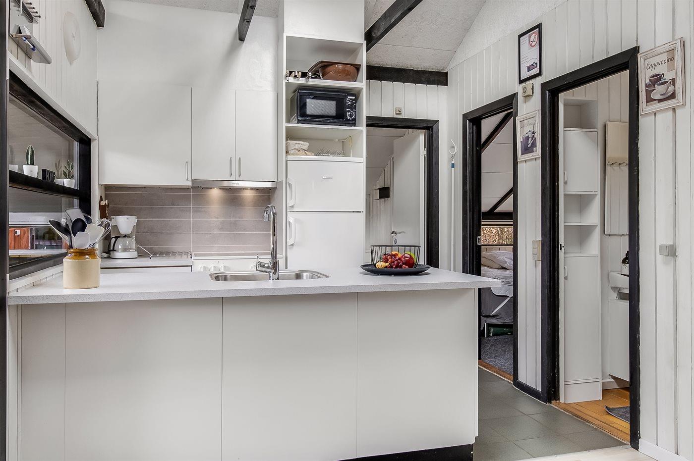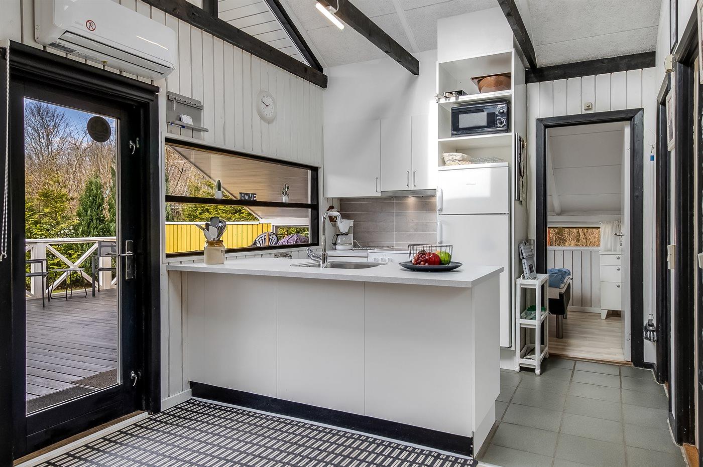 Køkkenet er udstyret med 1 køleskab. Der er 4 keramiske kogeplader, varmluftovn, mikrobølgeovn samt opvaskemaskine.