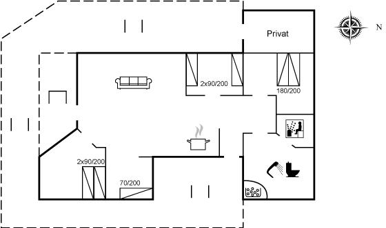 Der er i alt 3 soveværelser. Sovepladserne fordeler sig på: 4 sovepladser i dobbeltsenge. 3 sovepladser i enkeltsenge. 1 af disse sovepladser befinder sig i stuen.