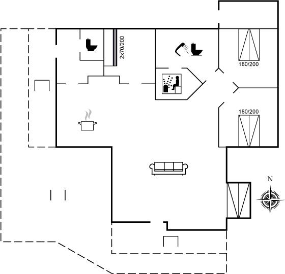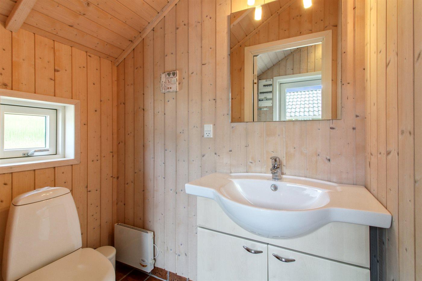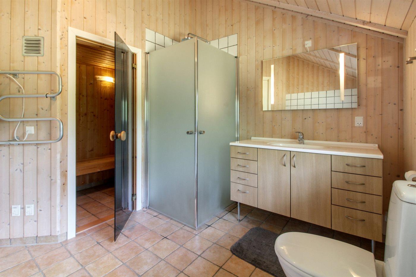 Der er 1 badeværelse med bruseniche og 2 toiletter, heraf 1 gæstetoilet. Der er gulvvarme på 1 badeværelse. Der er gulvvarme på gæstetoilettet. I saunaen er der mulighed for afslapning.