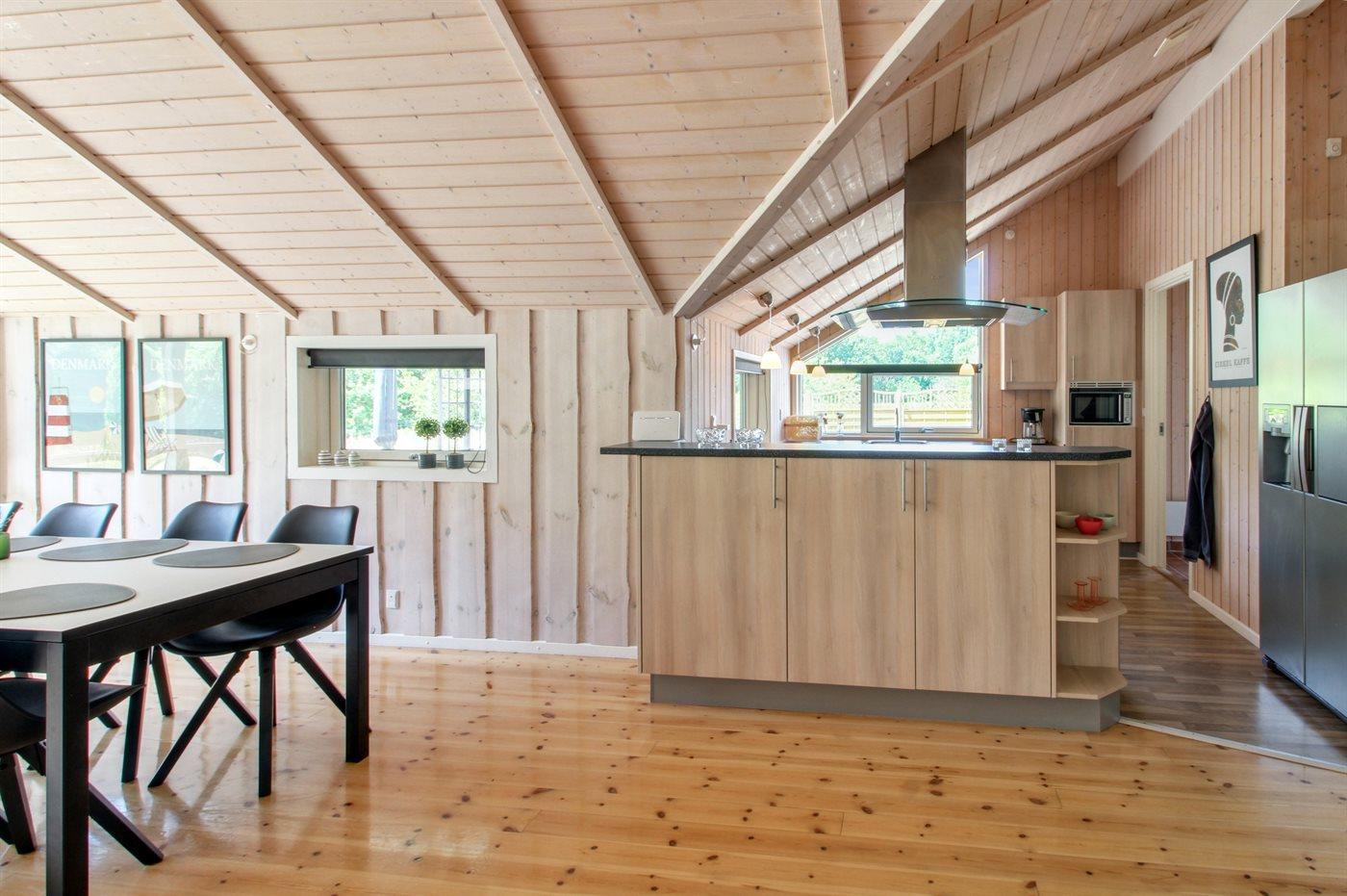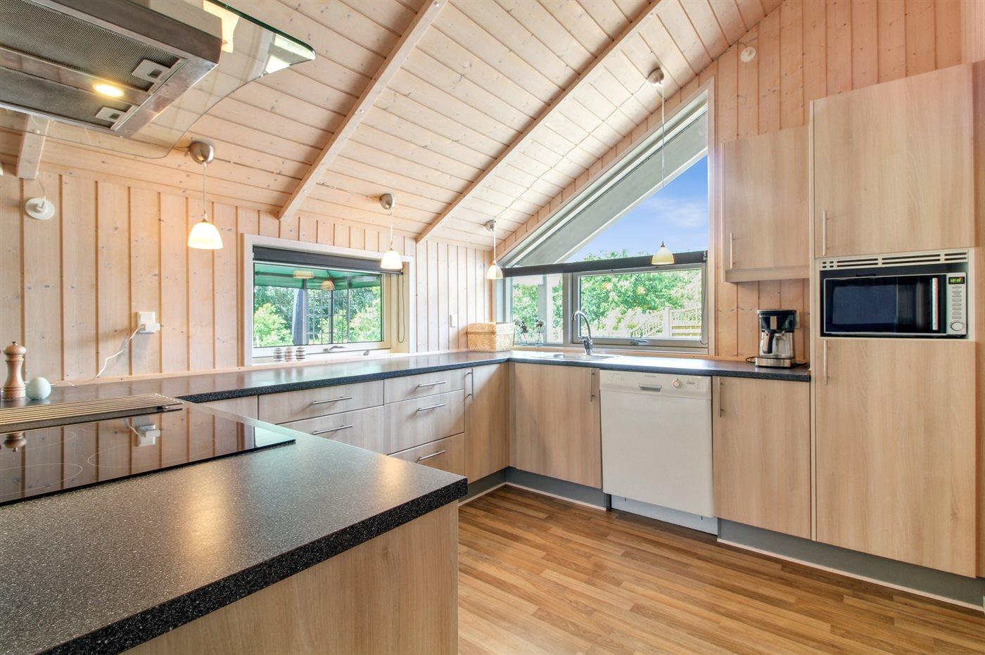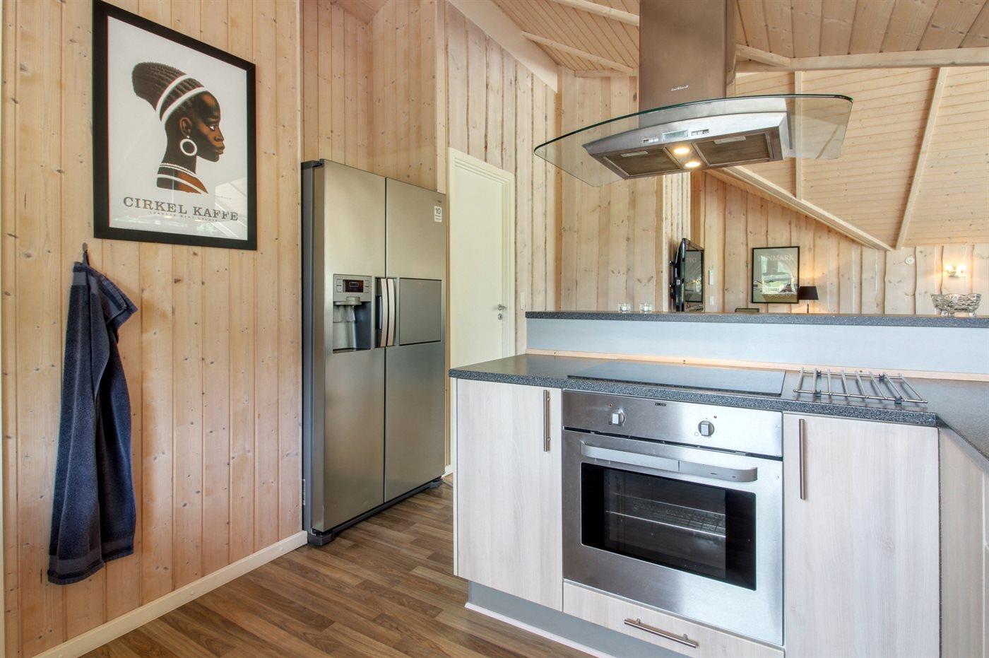 Køkkenet er udstyret med 1 køleskab. Der er 4 keramiske kogeplader, varmluftovn, mikrobølgeovn samt opvaskemaskine.