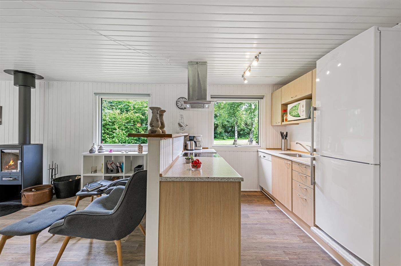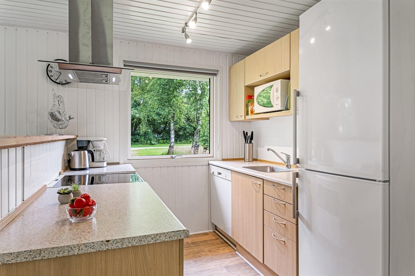 Køkkenet er udstyret med 1 køleskab. Der er 4 keramiske kogeplader, varmluftovn, mikrobølgeovn samt opvaskemaskine.
