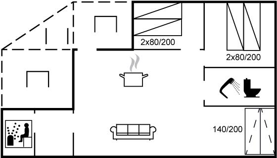 Der er i alt 2 soveværelser. Sovepladserne fordeler sig på: 4 sovepladser i dobbeltsenge. 2 sovepladser i sovesofa (dobbelt). 2 af disse sovepladser befinder sig i stuen. Derudover er der 1 stk. barneseng.