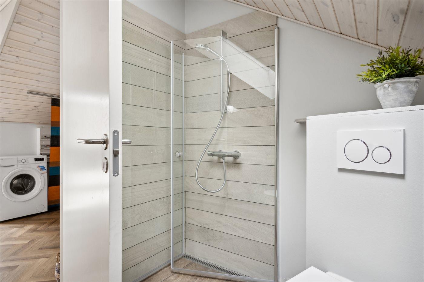 Der er 2 badeværelser med bruseniche og 2 toiletter, heraf 1 gæstetoilet. Der er gulvvarme på 1 badeværelse. Der er gulvvarme på gæstetoilettet.