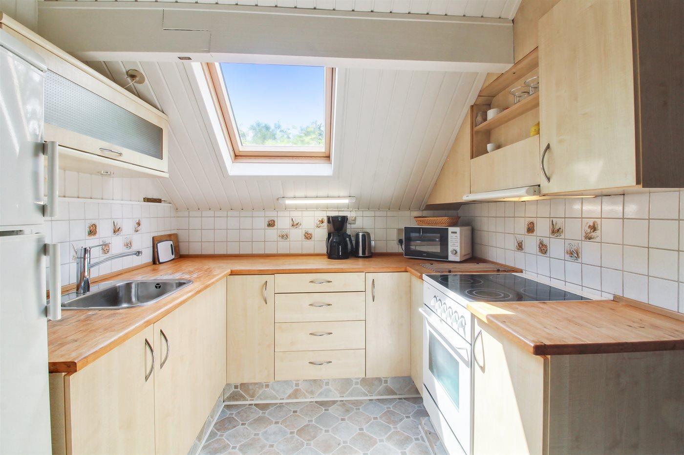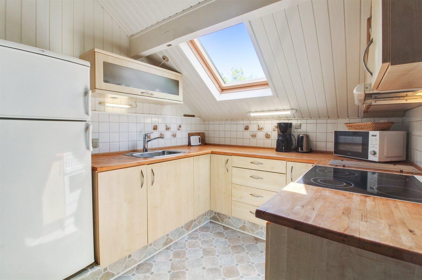 Køkkenet er udstyret med 1 køleskab. Der er 4 keramiske kogeplader, varmluftovn, mikrobølgeovn.