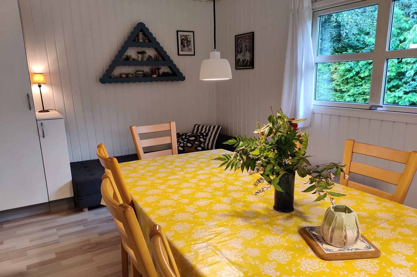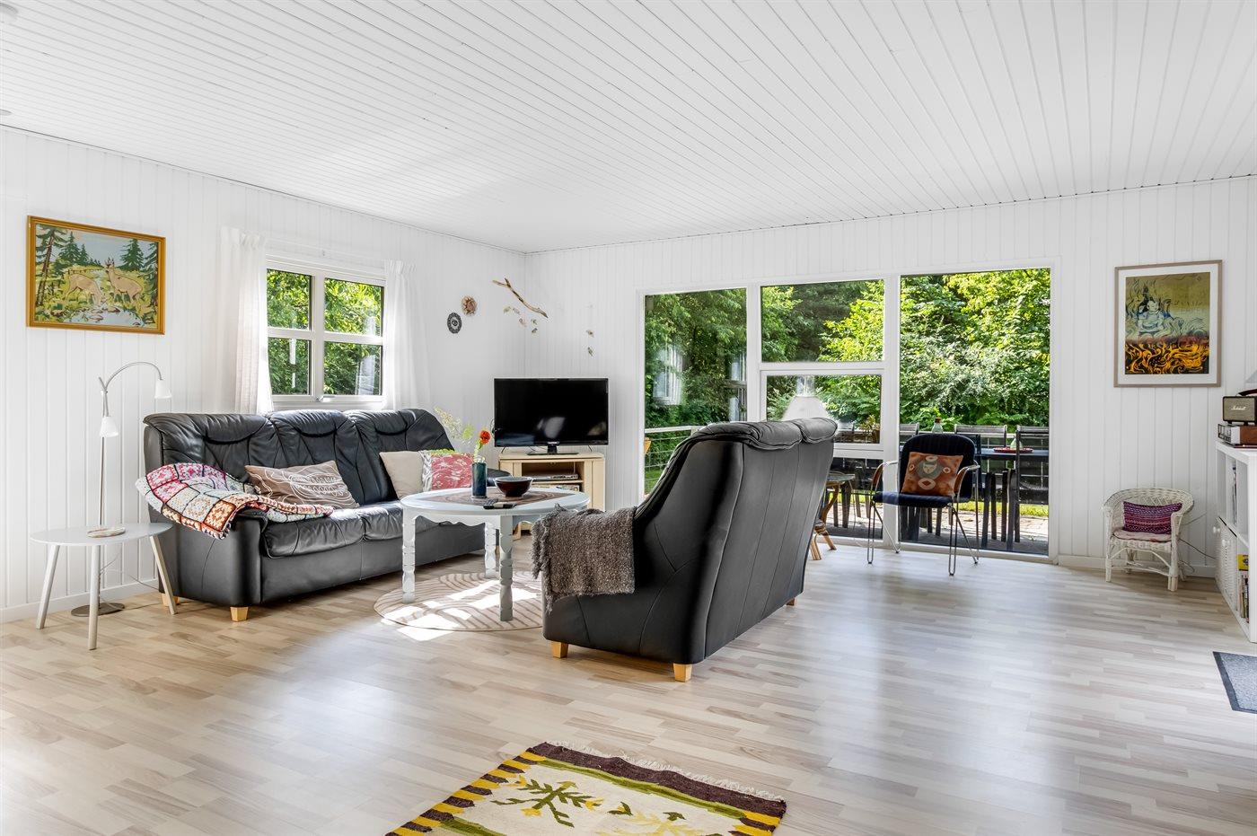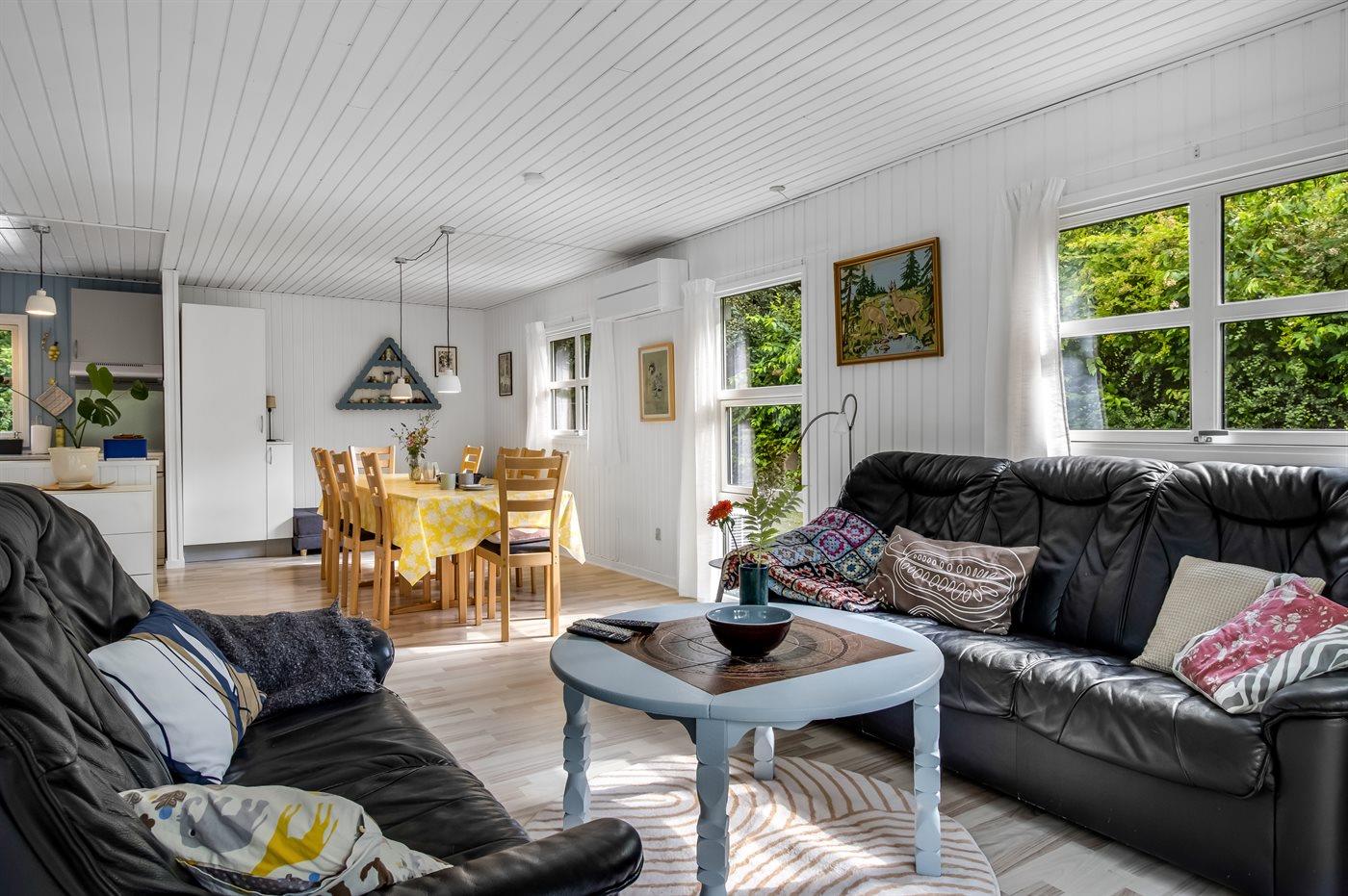 Selve sommerhuset, bygget i 1979, er på 84 m² og egner sig til 7 personer. I den lyse stue med store vinduer er der god plads til at nyde familiemiddagen, spille brætspil eller bare slappe af.