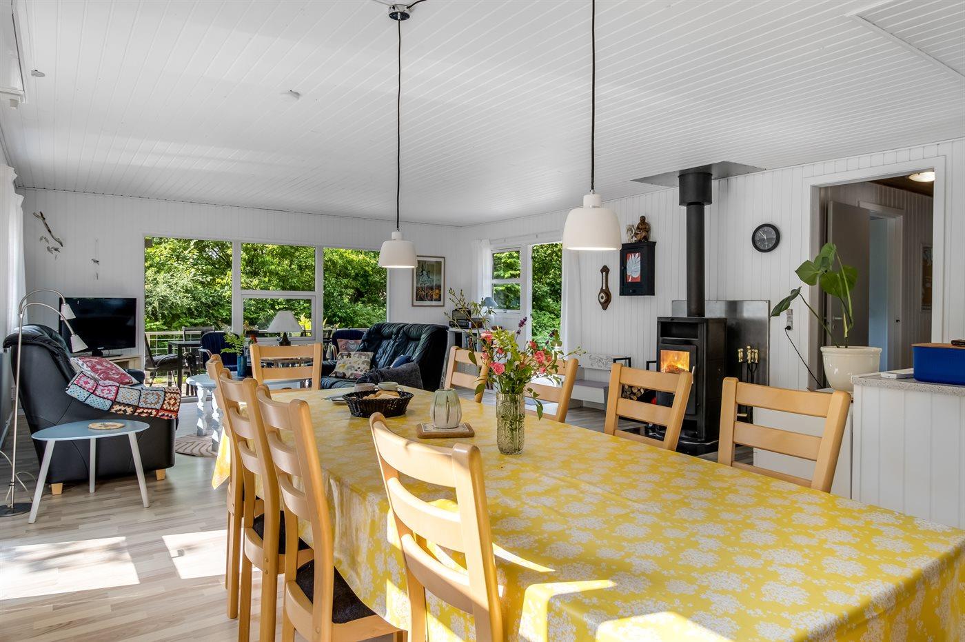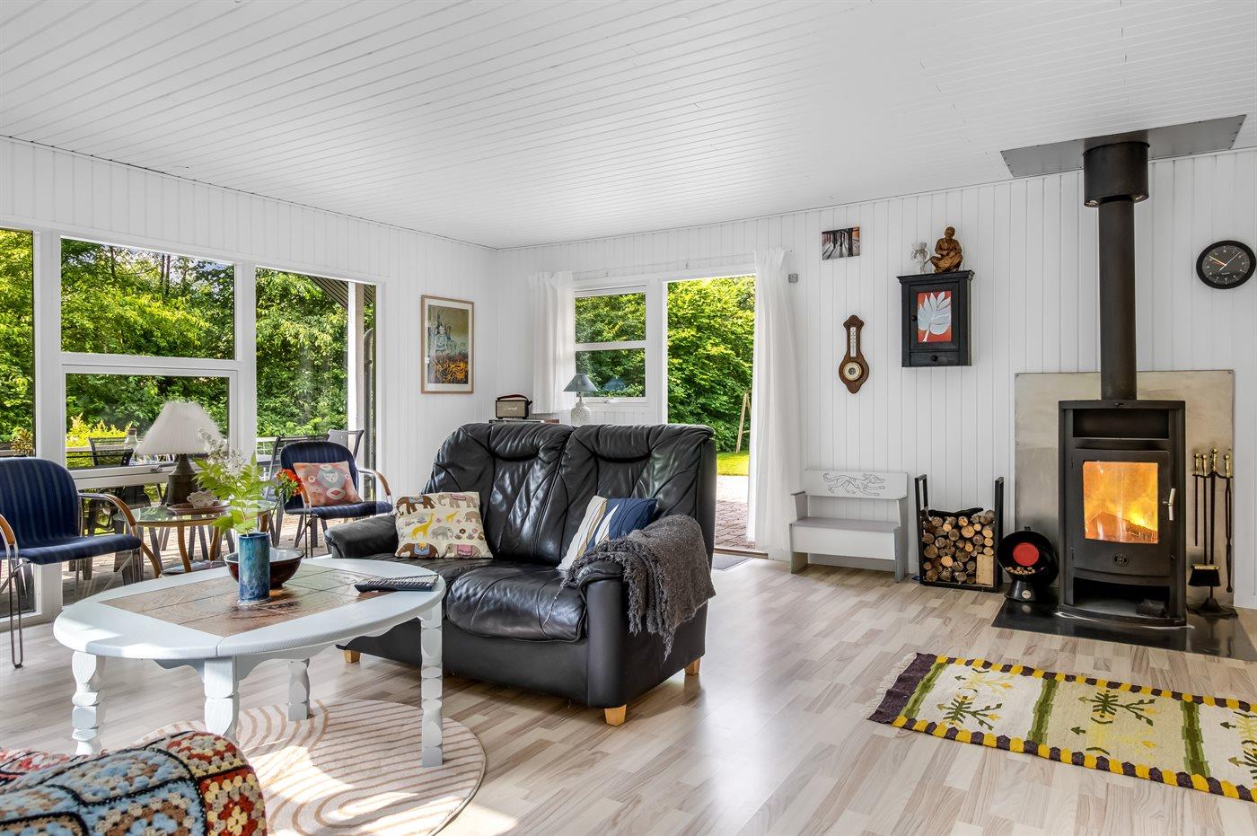 Til opvarmning kan man enten anvende den energibesparende luft til luft-varmepumpe eller skabe lidt ekstra hygge ved at tænde op i brændeovnen.