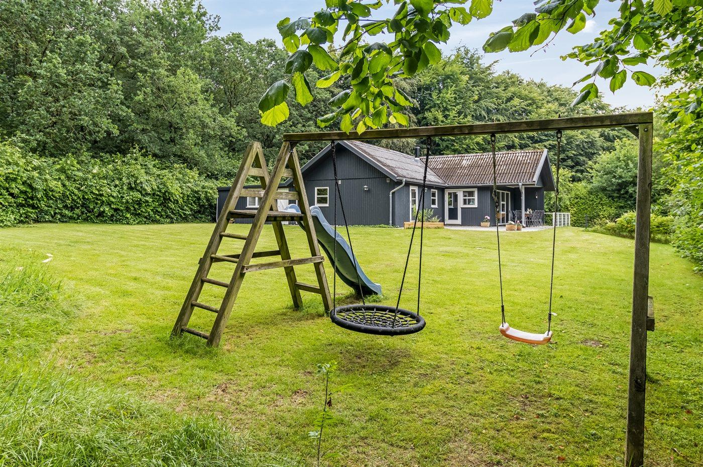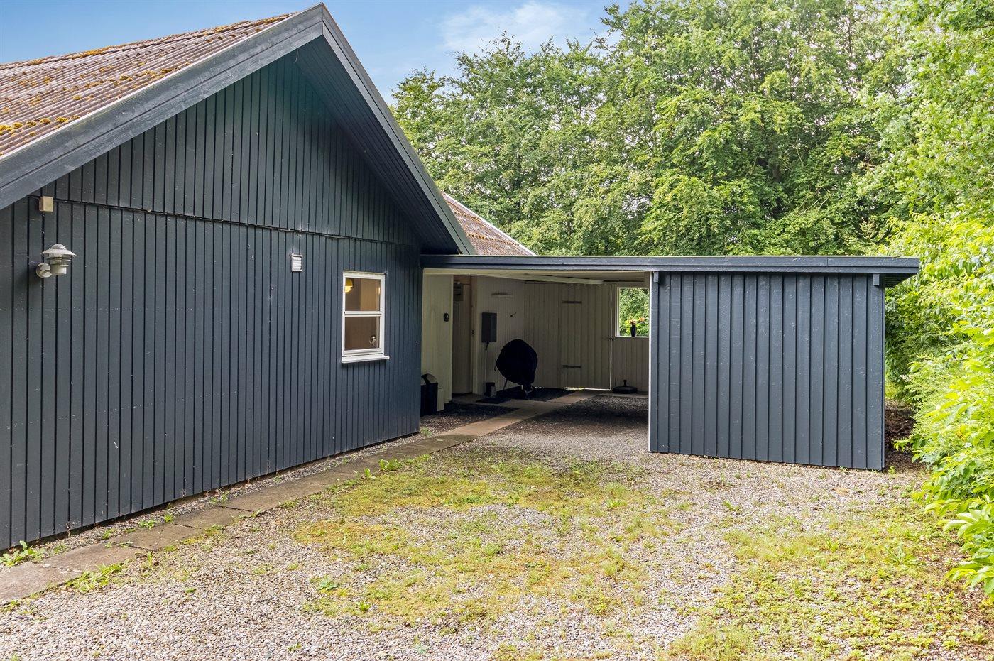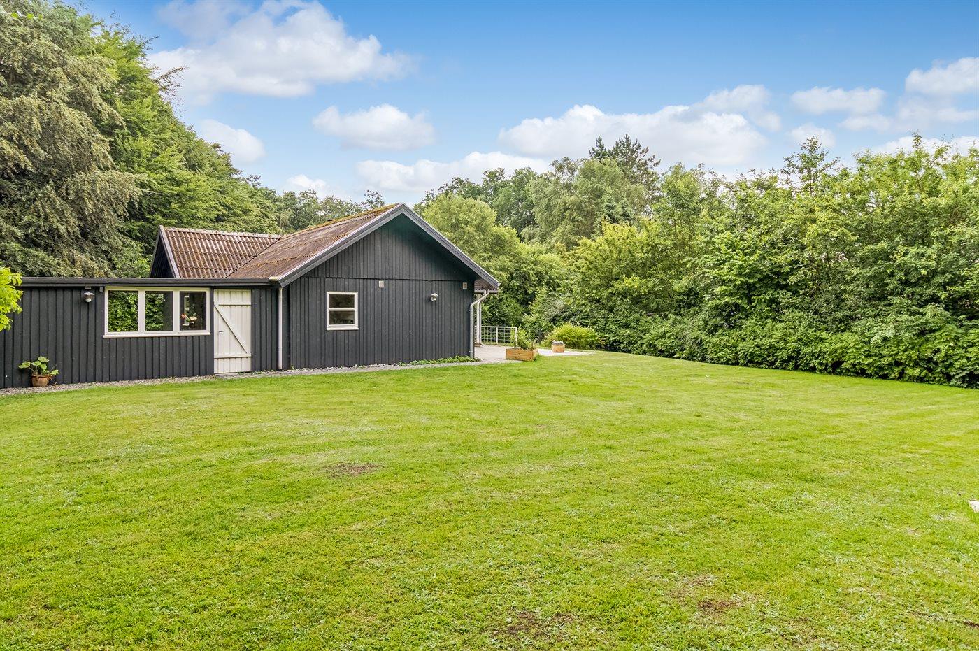 Sommerhuset ligger på en 877 m² stor naturgrund, som indbyder til afslapning, boldspil og havespil. I den indhegnede have er der rutsjebane og gynge, og hunde er velkomne. På den åbne, overdækkede terrasse er der grill til rådighed, og på den anden side af huset findes der carport.