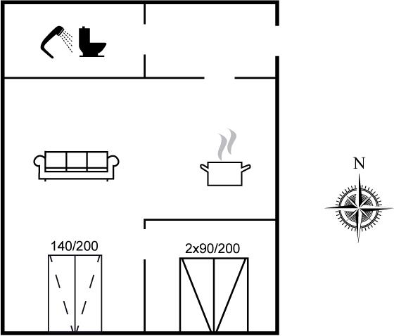 Der er i alt 1 soveværelse. Sovepladserne fordeler sig på: 2 sovepladser i enkeltsenge. 2 sovepladser i sovesofa (dobbelt). 2 af disse sovepladser befinder sig i stuen.