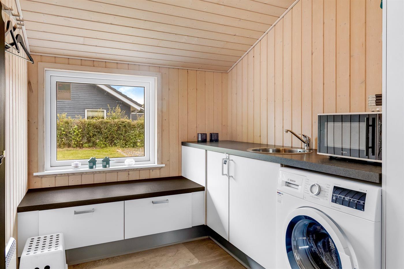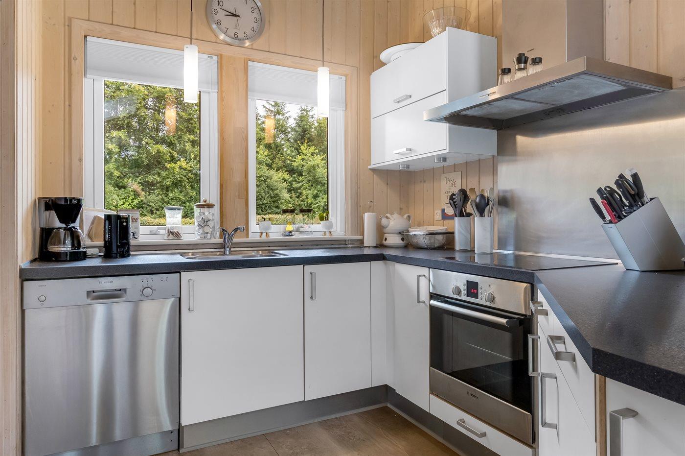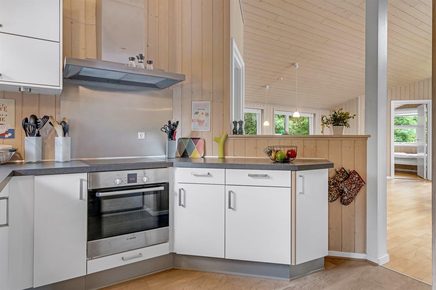 Køkkenet er udstyret med 1 køleskab. Der er 4 keramiske kogeplader, varmluftovn, mikrobølgeovn samt opvaskemaskine.